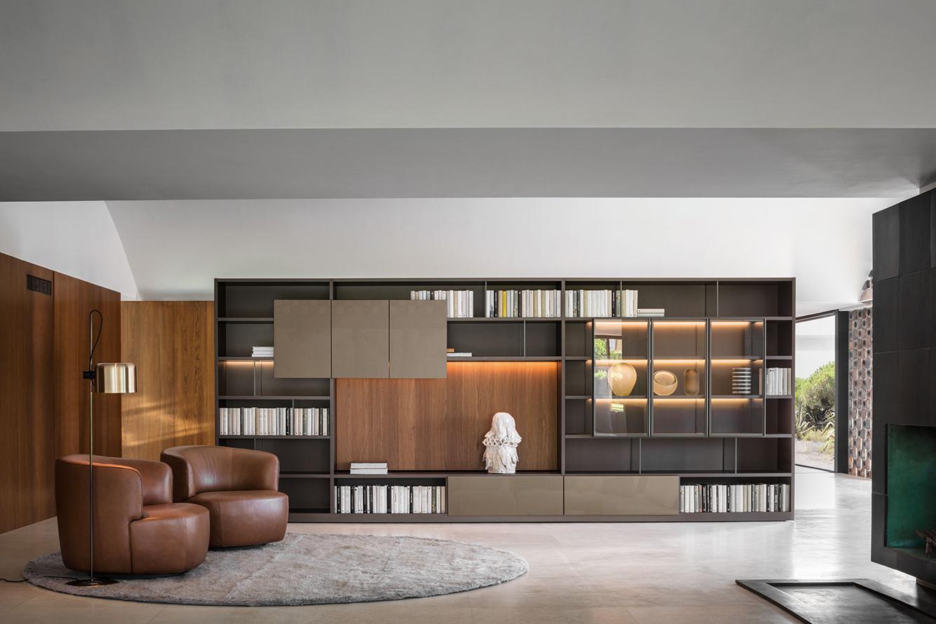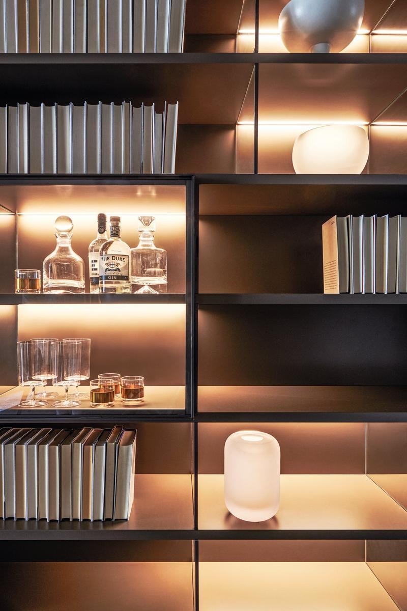 Enhanced with integrated lighting, the 505 storage wall adds a touch of elegance to any room. The innovative glass door with a handle integrated into the metal profile provides easy access to your items while maintaining a stylish look. Slim glass panels can be strategically placed on the sturdy shelves to create designated spaces for books and decor, ensuring everything is beautifully showcased.