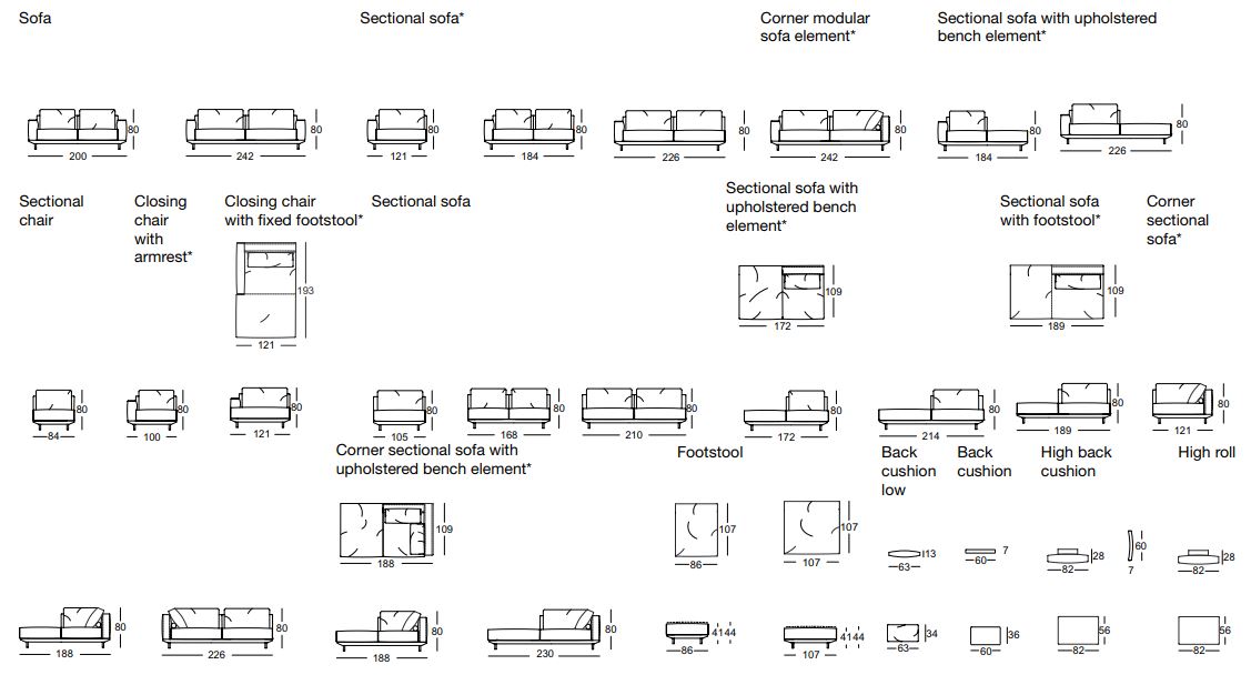 For ultimate comfort, the sofa comes with a fluffy back pillow filled with 100% microfibers in compartments. You can choose between two seat height options of 41 cm or 44 cm to suit your preference. The sleek aluminum cast foot adds a touch of modernity to the design, available in three stylish colors: Traffic black, Umbra grey, and Ochre-beige metallic.