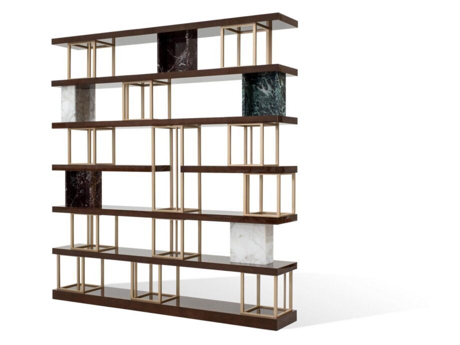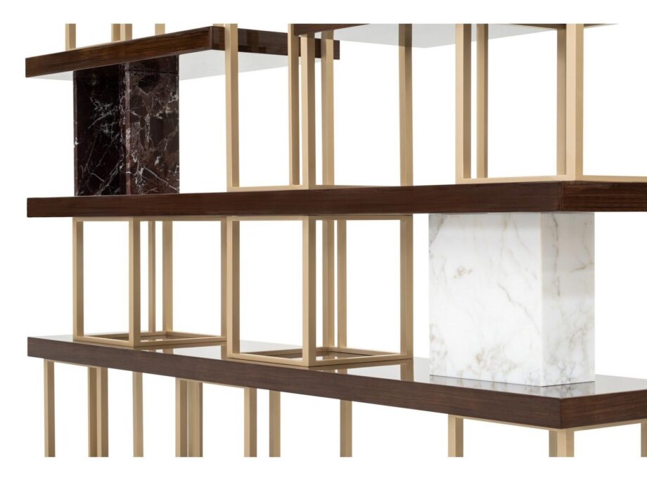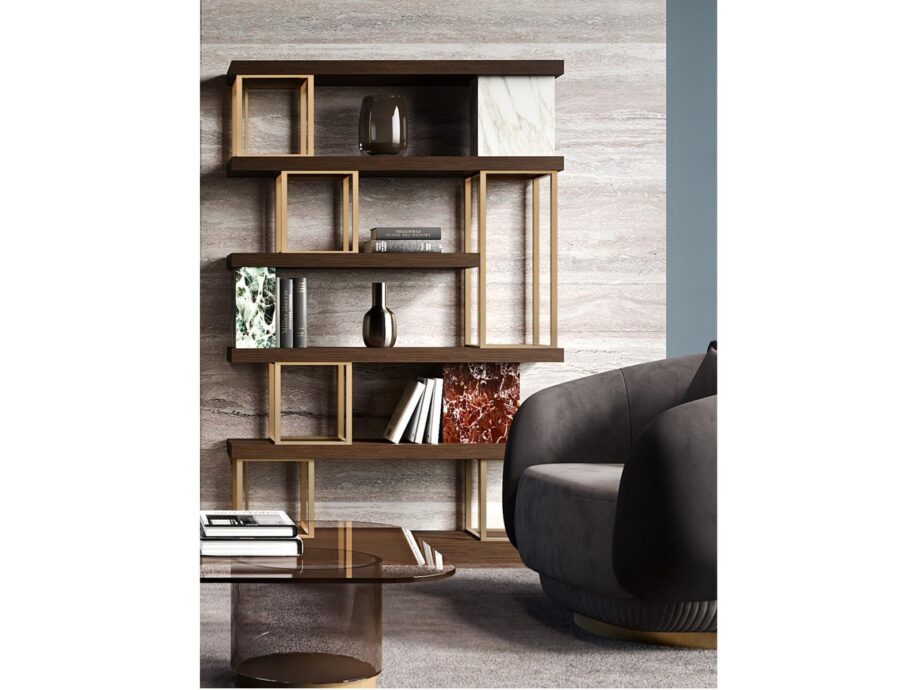 Discover the epitome of elegance in the form of the Aida double-sided wall bookcase, a stunning addition to our Identity Collection. With an eye-catching fusion of sophisticated materials – metal, wood, and natural stone, Aida is more than just a bookcase. This piece infuses any space with a distinctive modern style that effortlessly complements various interior design themes.