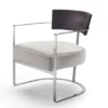 Alfred’s frame is constructed from wood with polyurethane and Dacron padding, ensuring durability and comfort. The upholstery options include fabric or leather covers, with the choice of different colors of grosgrain piping for a personalized touch. The base comes in various finishes such as black chrome, satin, chromed, bronzed, burnished, or champagne, adding a touch of sophistication to the design.