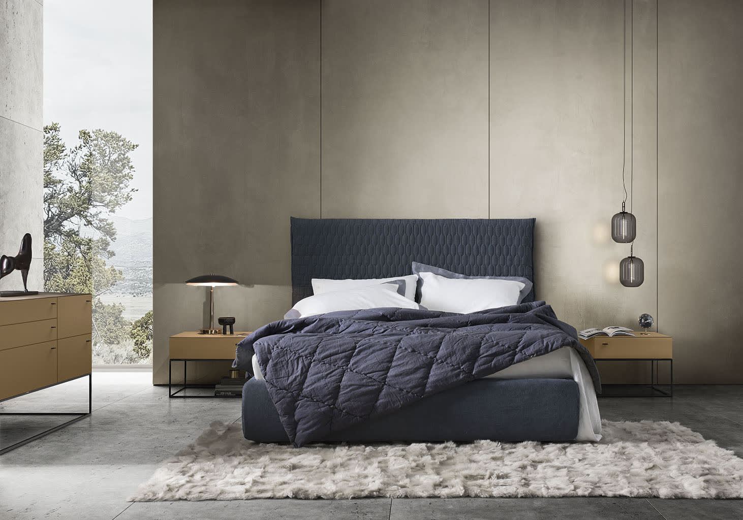 The Allen 2 bed, designed by Enrico Cesana, embodies modern comfort and refined style for your bedroom. The standout feature of Allen 2 is its tall, upholstered headboard, adorned with striking hexagonal stitching that lends the model dynamism and sophistication. This designer bed perfectly complements interiors where both aesthetics and functionality are highly valued.