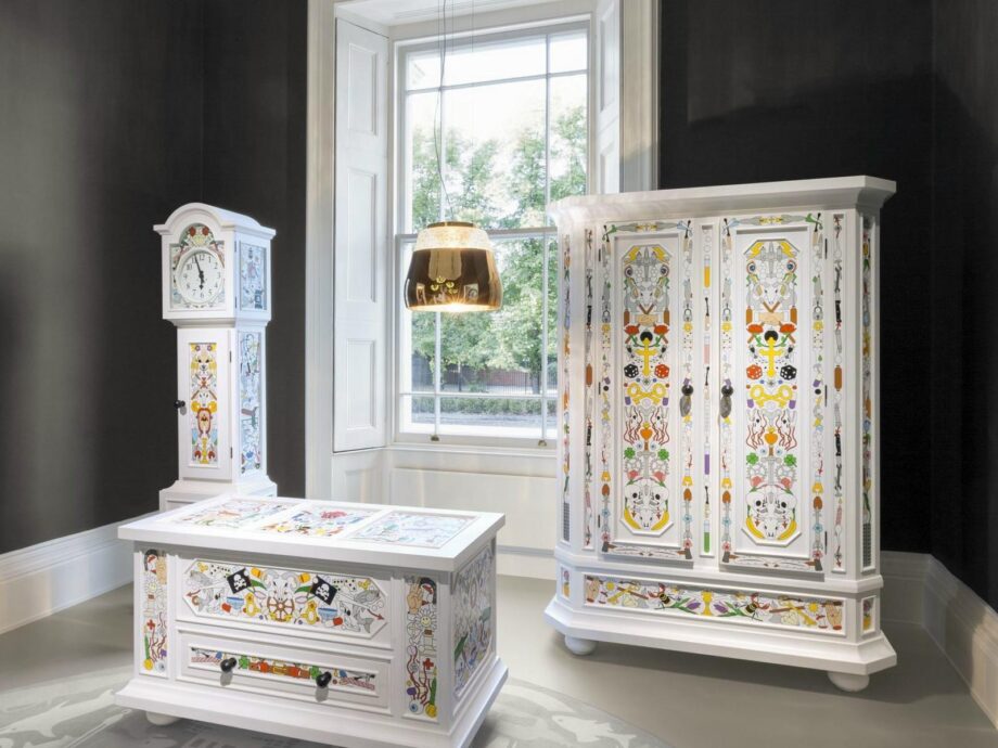 Step into a world of timeless elegance with the Altdeutsche Clock from Studio Job’s exquisite collection. This modern take on a classic Grandfather clock is a true work of art, crafted from solid pine and hand-painted to perfection. The clock features intricate cut glass detailing and a hidden compartment that holds a special surprise from Studio Job.