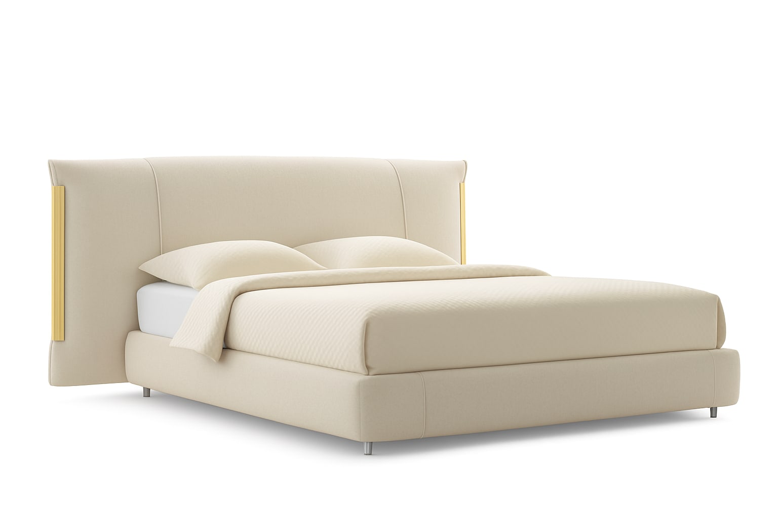 The Amal bed features an upholstered headboard adorned with exquisite metallic trims, creating a stunning focal point in any bedroom. The trim detail adds a touch of glamour and sophistication, highlighting the softness of the upholstery materials. Choose from three stunning trim finishes – polished gold, matte polished, or polished black nickel – to complement your preferred cover material.