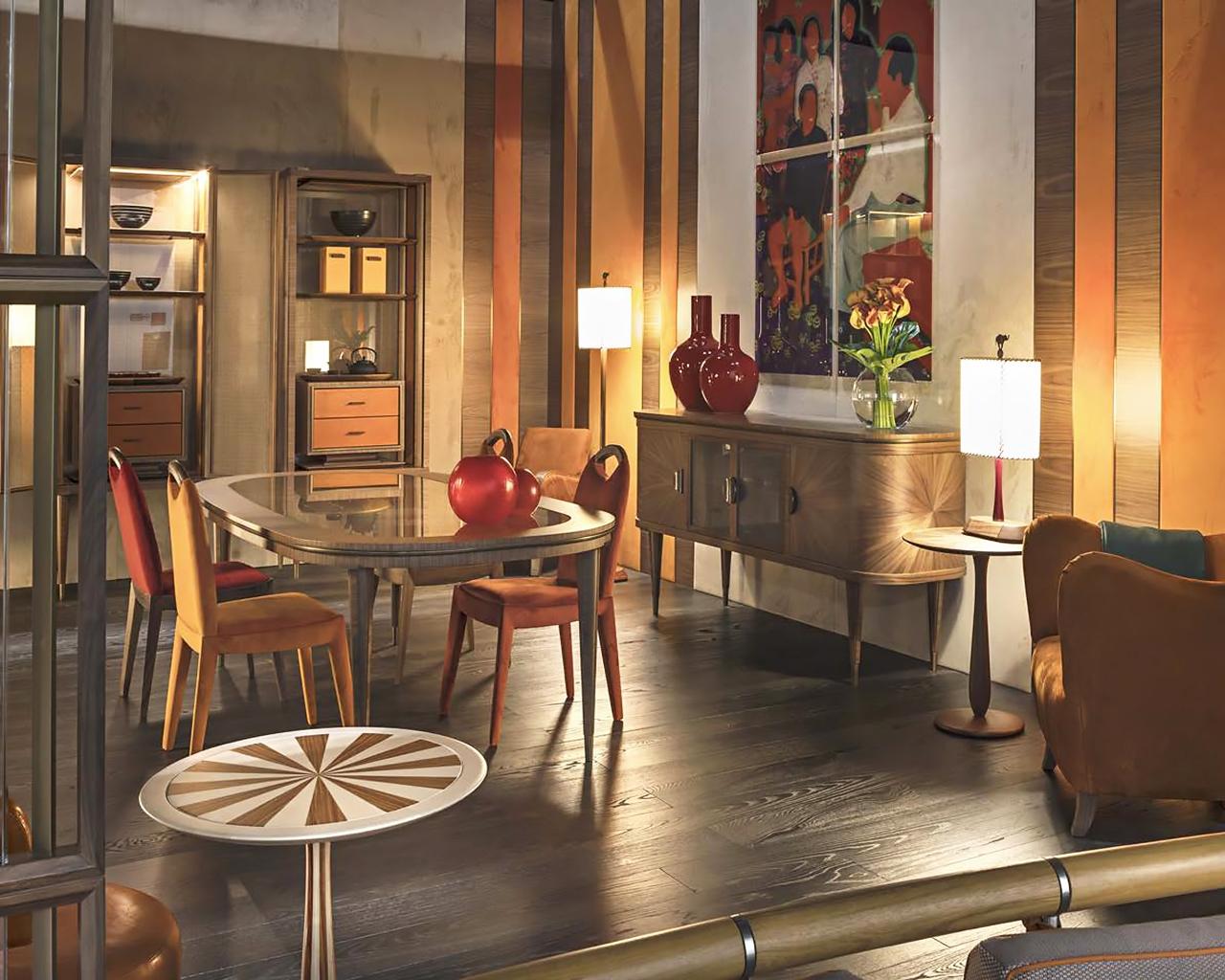 The trestle-based structure of the Antonietta chair exudes refinement and style, while the medallion chairs offer a nod to traditional elegance. Made from Canaletto walnut and upholstered in soft velvet, this chair exudes opulence and glamour, adding a touch of luxury to any room.