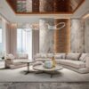 The Arabesque sofa’s distinctive modular and corner design allows for versatile placement in any room, whether it be a cozy living space or a sophisticated office environment. The back of the sofa is adorned with an array of pillows in different sizes, providing both support and style.