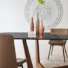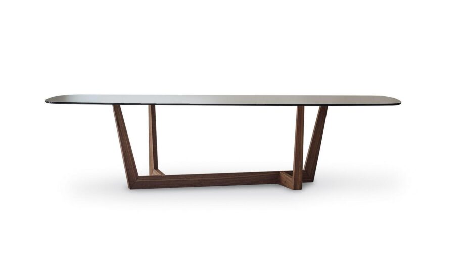 The Art Wood table is a testament to clear and rational design philosophy. Its solid wooden base is a striking trapezium shape, arranged diagonally beneath the table top. This unique design not only adds a dynamic and sculptural impact to your living room but also optimizes space with minimal obstruction. The table’s robust structure is perfectly balanced by the lightness of its top, available in glass or ceramic, adding an air of sophistication to your space.