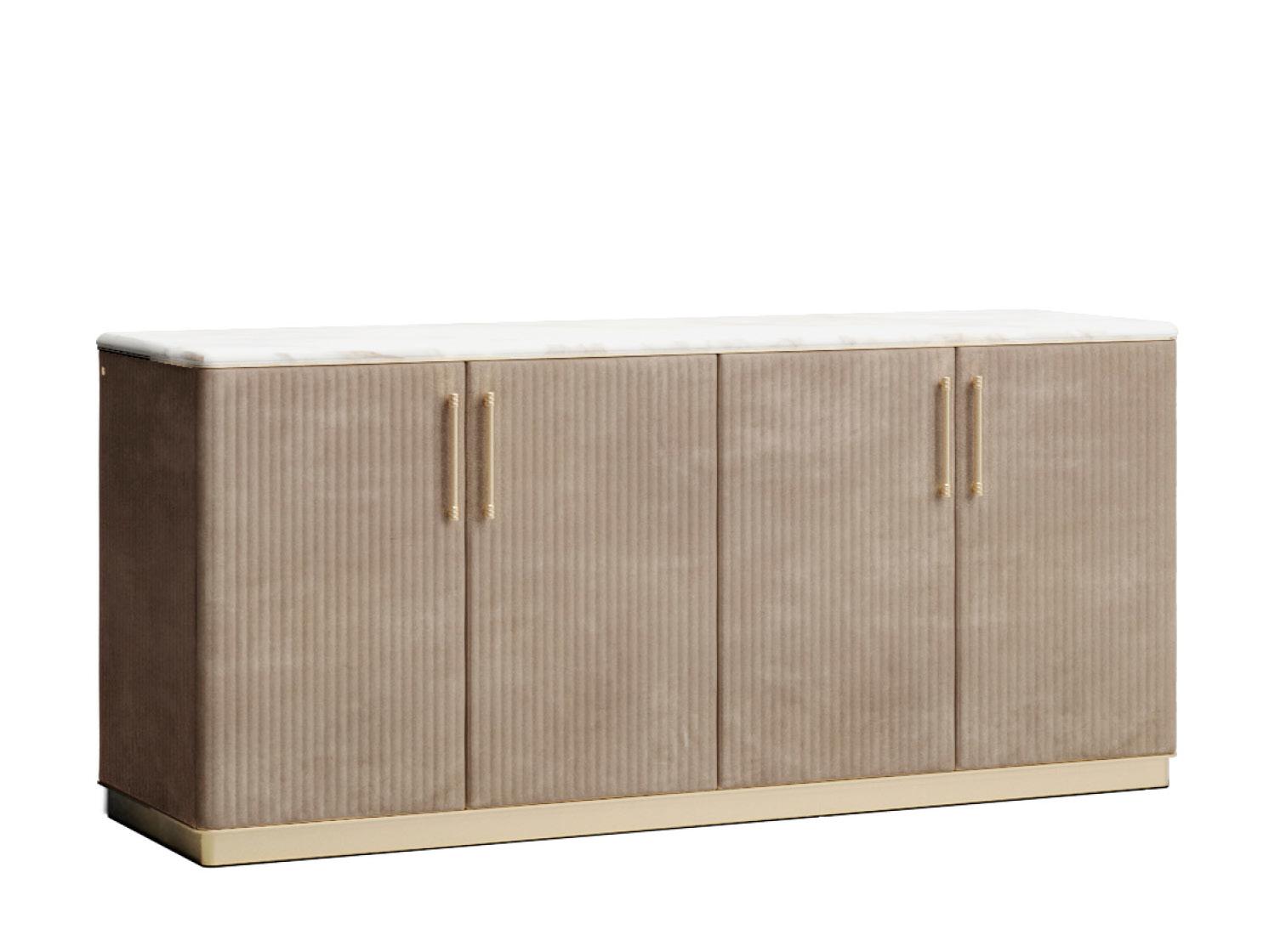 Featuring upholstered doors and side panels, Augusta is a true statement piece that will elevate any living space. The top of the sideboard can be customized in lacquered wood, solid wood, or luxurious marble, adding a touch of opulence to the design. The chrome-plated stainless steel profiles and base plate complement the sleek lines of the piece, while the interior is finished in a glossy Pietra color for a refined look.