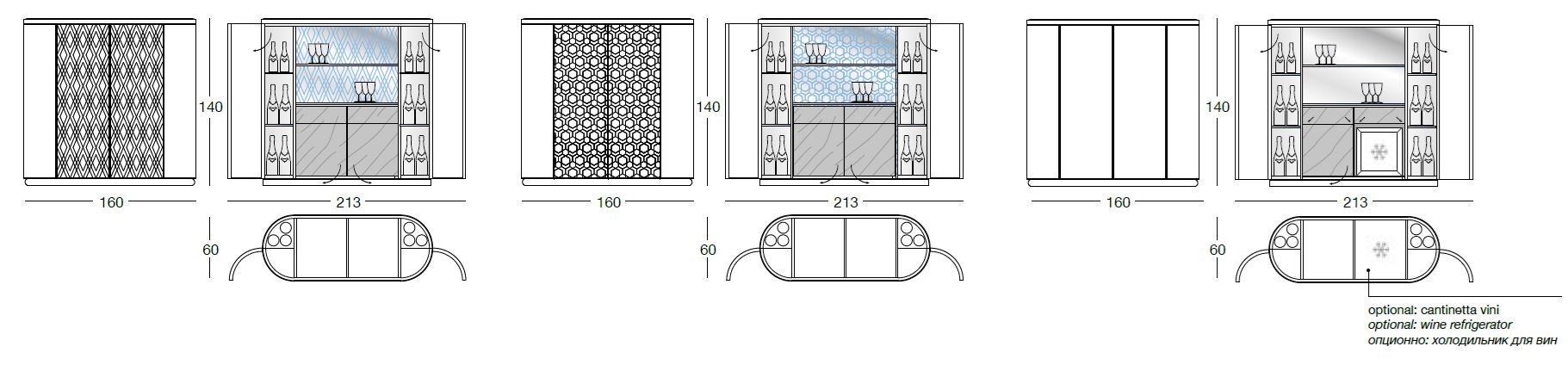 Perfect for entertaining, Beverly features two drawers and an optional mini wine refrigerator, making it ideal for hosting guests in style. The top surface finish is available in 5mm bronze or smoky bevelled mirror, adding a touch of glamour to your home bar setup.
