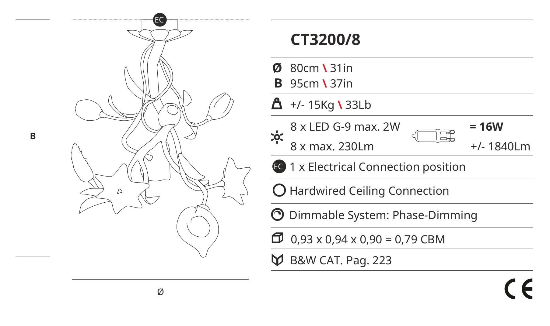 Equipped with a dimmer for customizable lighting options, this ceiling lamp is versatile and practical. Whether you prefer the soft glow of halogen or the energy-efficient illumination of LED bulbs, the Bouquet Ct3200/8 offers both options to suit your needs. Embrace the beauty of nature with this exquisite lighting fixture inspired by floral themes and natural patterns.