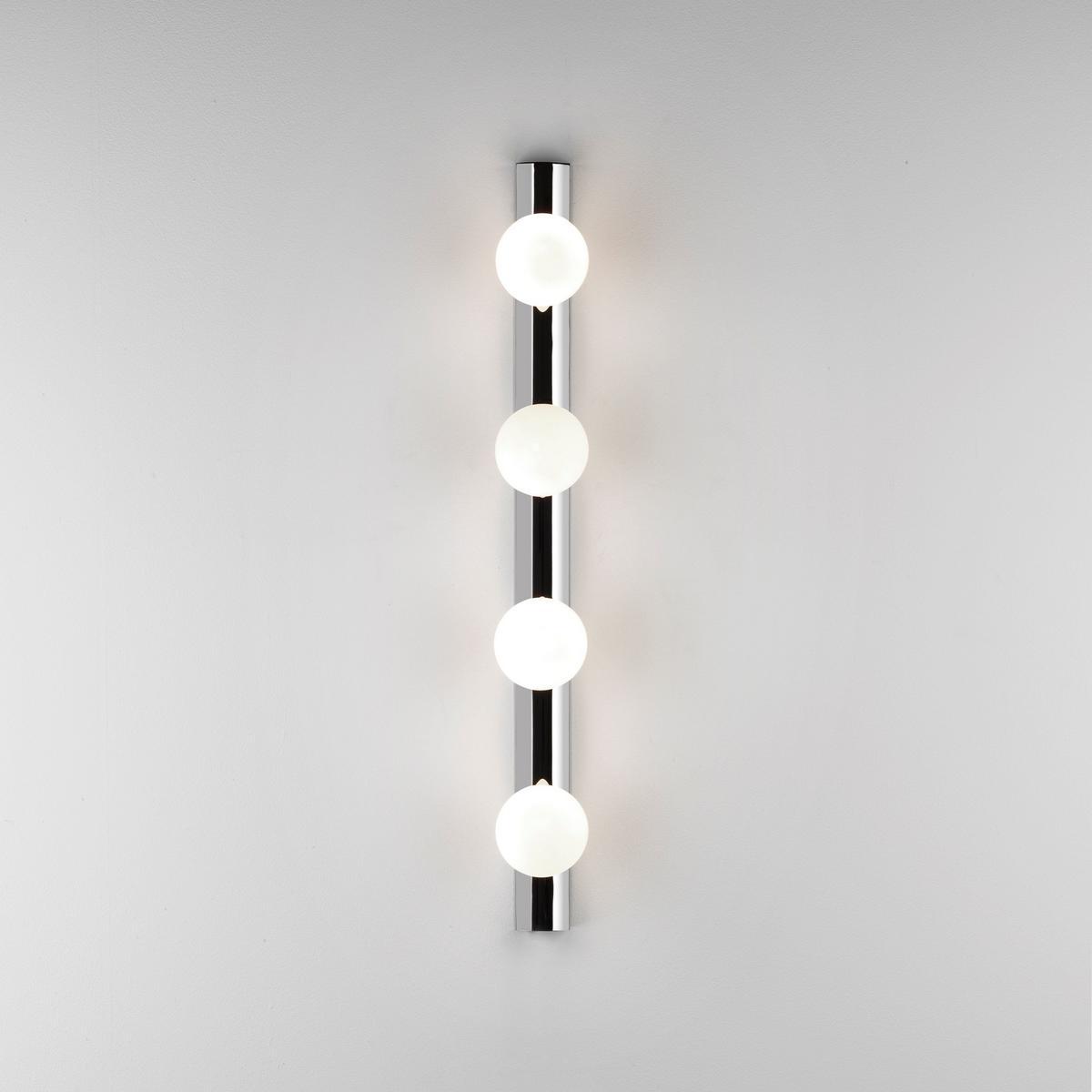 Inspired by the glamour of Hollywood mirrors, the Cabaret 4 II wall lamp features four blown glass globes that evenly distribute light for a flattering glow. Its slender profile and versatile orientation make it ideal for positioning horizontally or vertically around a mirror, adding a touch of elegance to your bathroom decor.