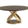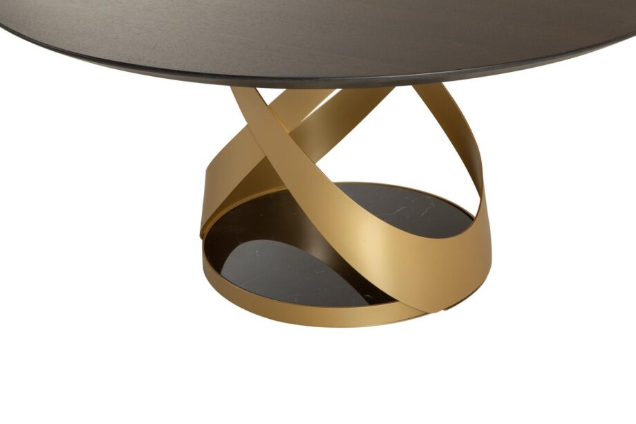 The Capri table features a sleek round shape with a solid dark oak wood top that adds a touch of natural beauty to your space. The metal base in an opaque gold finish provides a striking contrast to the dark wood, while the black Marquinia marble base adds a luxurious touch to the design.