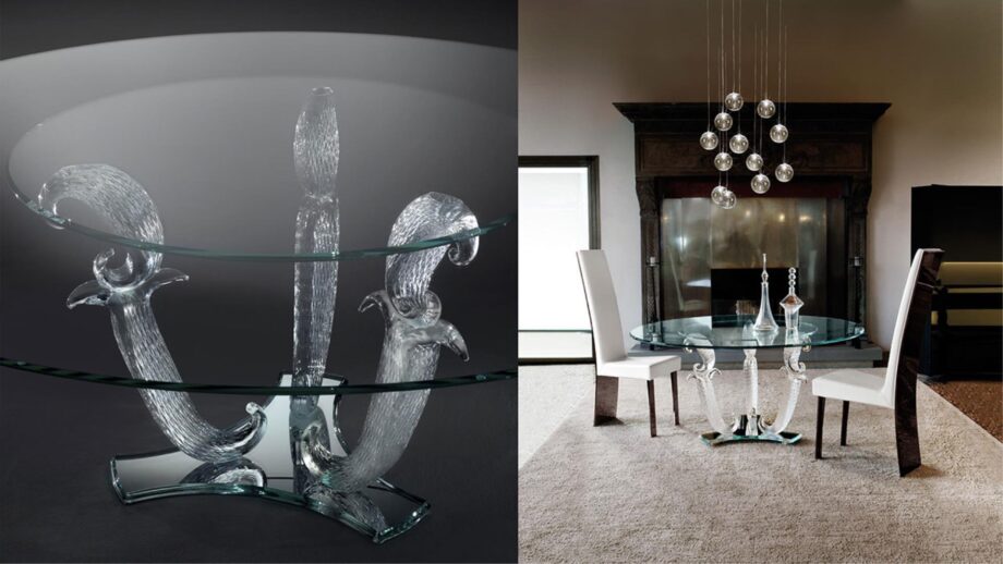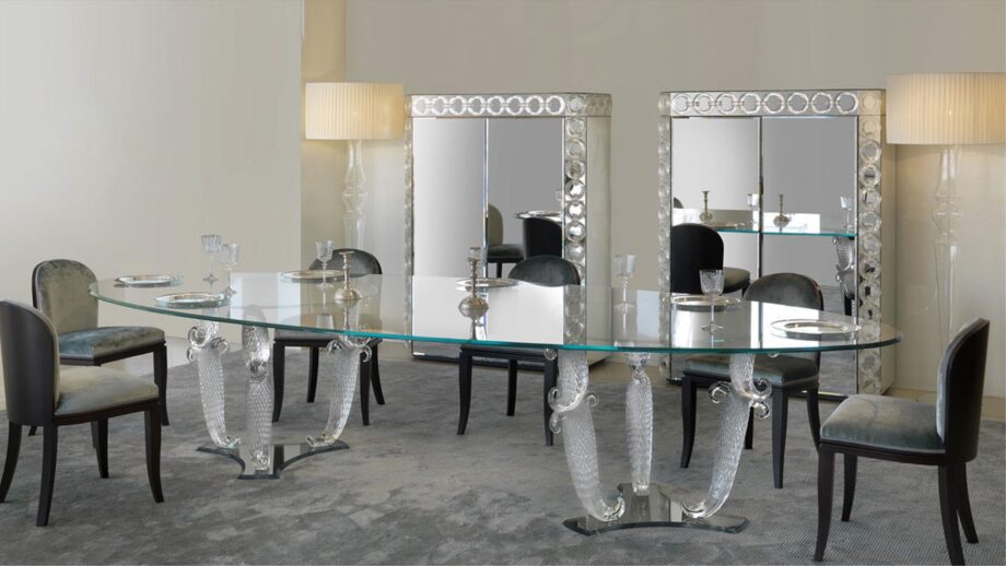 The Casanova table features a stunning base made of 3, 4, or 5 Murano glass legs, available in a straightforward or gold finish, resting on a plinth of smoked mirror glass. The oval-shaped top, crafted from clear glass with polished edges, adds a touch of luxury to any dining room.