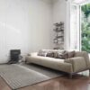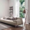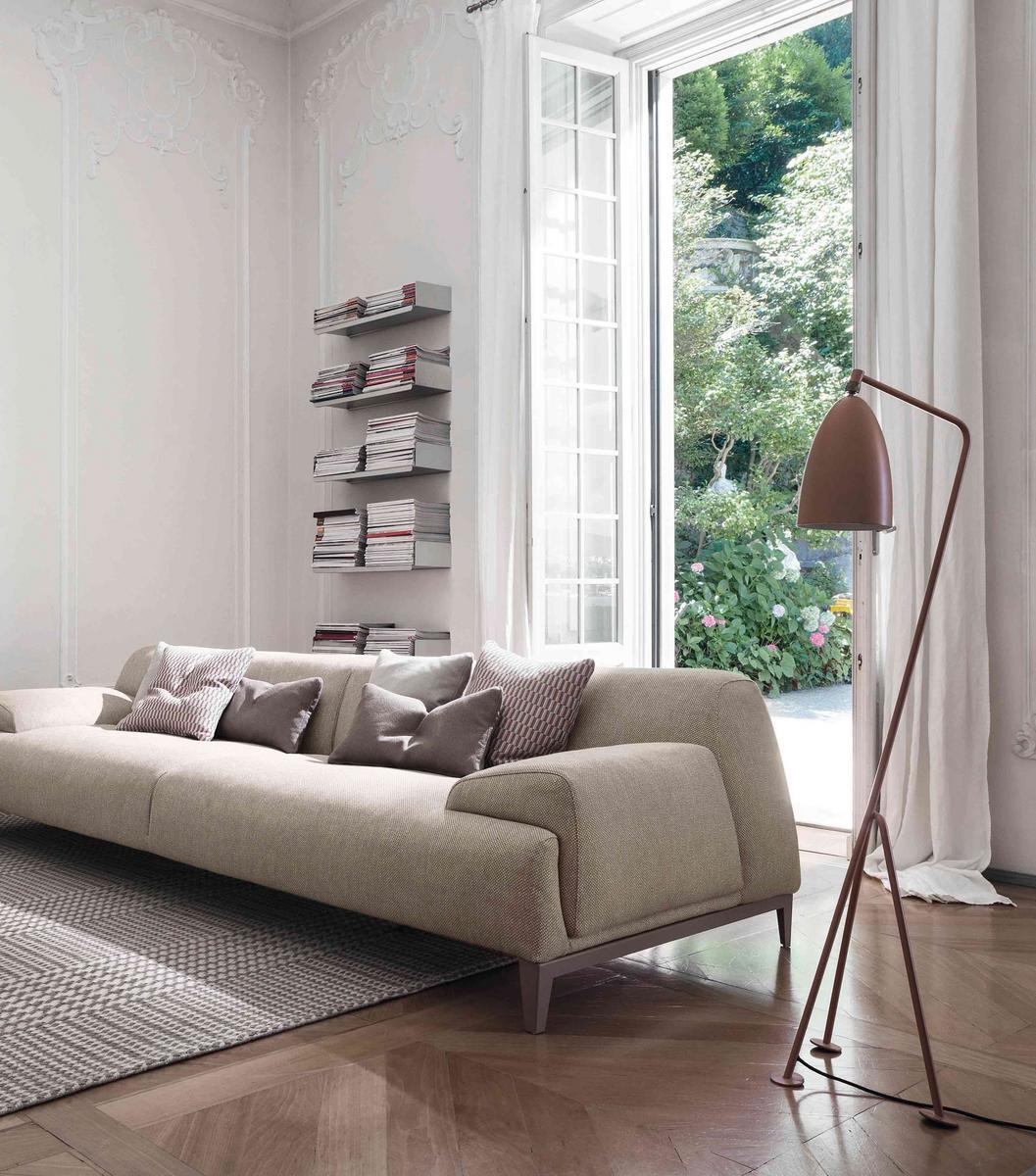 The sofa stands on sleek, matt-painted metal feet available in a range of colors including anthracite grey, black, white, brown, and dove-grey. These feet give the Cave sofa a visually lighter feel, creating the illusion of a suspended seating surface.