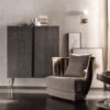 Constructed from the finest wood materials, the City sideboard features two doors that open to reveal a spacious internal compartment with flat polished glass shelves. The doors are adorned with protective steel rods that double as a display shelf for your prized glasses and bottles. The veneered plywood framework is meticulously crafted with a patinated brushing in contrasting tones, adding depth and character to the piece.