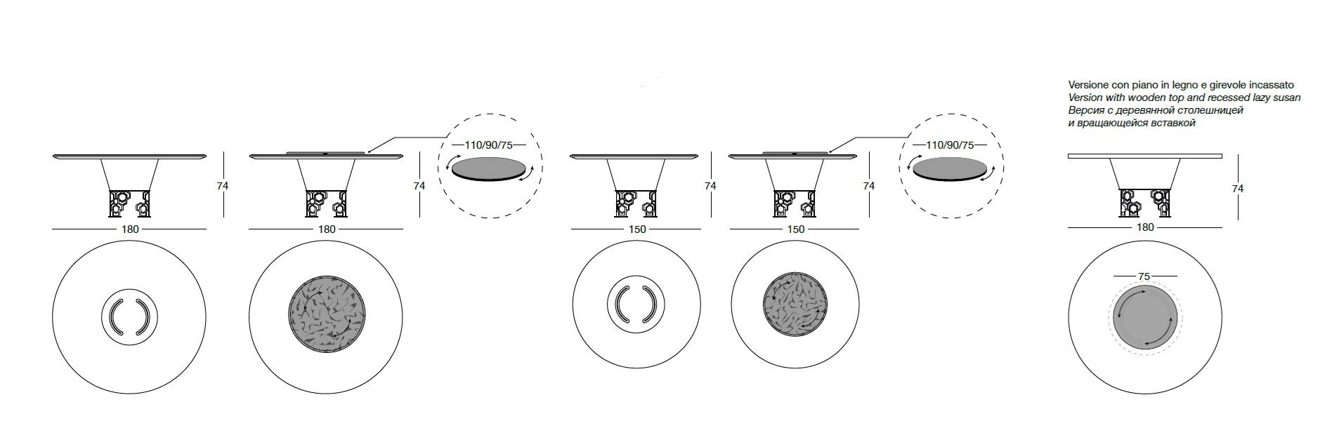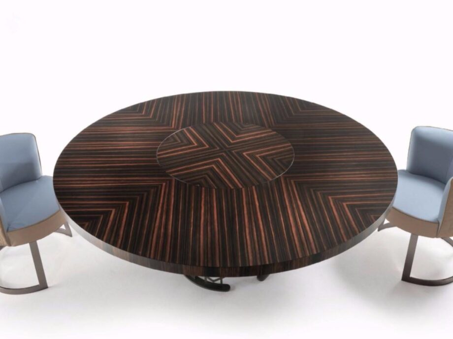 Crafted with a blend of leather, metal, and veneer materials, Clairmont boasts a central leg supporting a thick wooden top available in rich matt ebony or matt Canaletto walnut finishes. The round table features a revolving tray in various finishes such as black painted crystal glass, glossy lacquered wood, and luxurious marble.