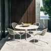 The Claydon Outdoor Table’s design narrative is captivating, maintaining a purity characterized by its contrasting base, robust yet visually light. The deceptively complex base shape plays with the dimension, creating an irresistible symphony of changing widths. Crafted from die-cast aluminum, the base showcases a unique bush-hammered texture, generously painted in a fresh white finish, infusing a sense of spirited vitality outdoors.