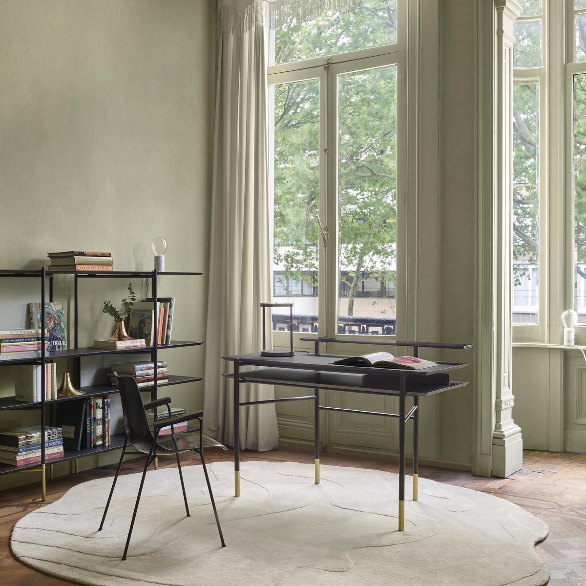 The top of the desk is crafted from MDF boards finished in dark smudged oak veneer or natural walnut, with elegant inclined edges. The upper rack is adorned with gleaming dark marble-impact ceramic stoneware, adding a touch of luxury to the design. In 2019, the Clyde range was expanded to include a desk, showcasing the signature style of rounded steel design and base, along with a mix of materials such as marble-impact ceramic stoneware and dark smudged oak veneer or natural walnut.