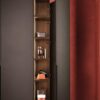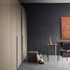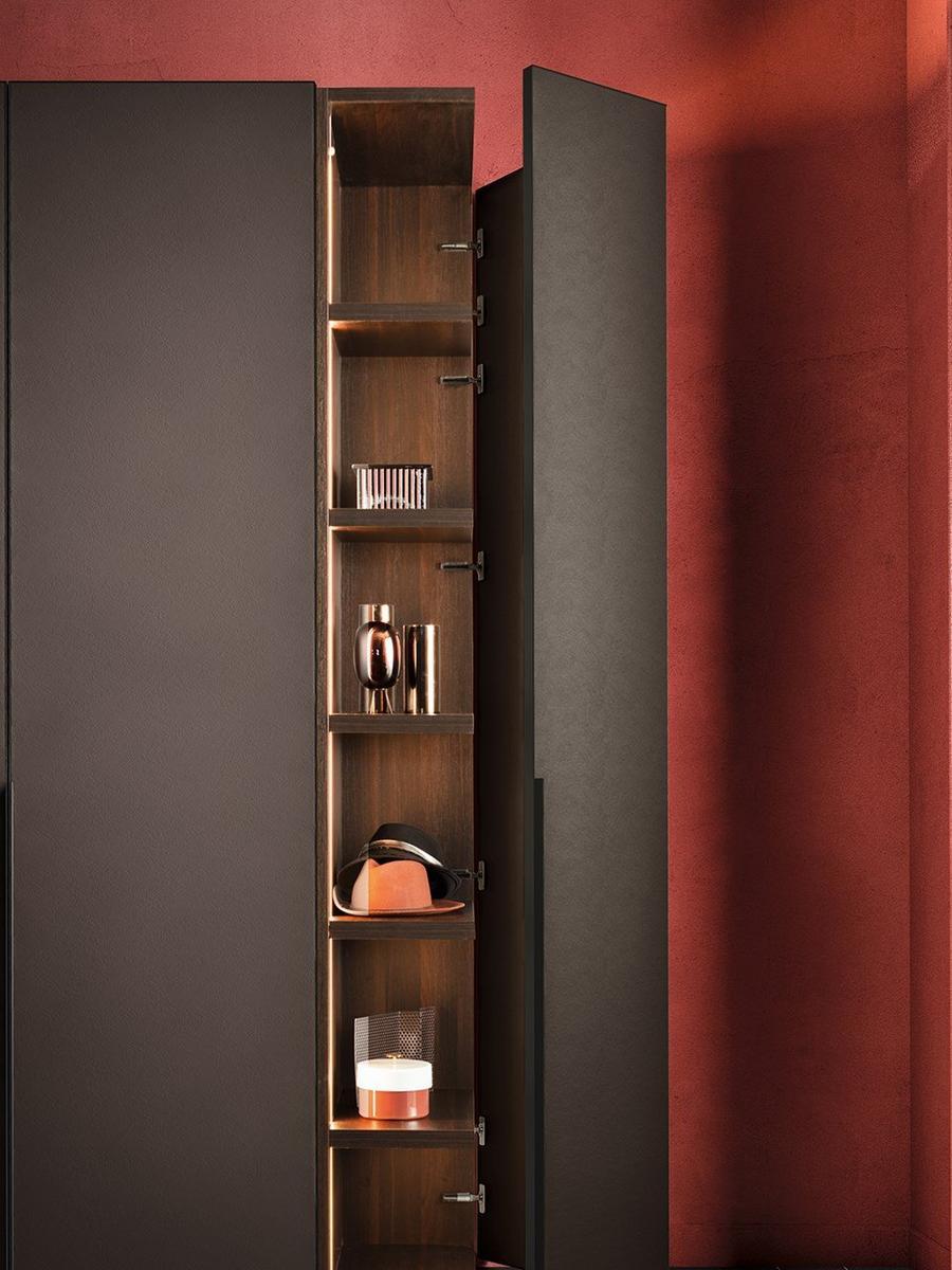 The Cornice collection showcases a minimalist aesthetic with a thin, continuous line that accentuates the vertical modules. The lacquered or dark anodized aluminum edge adds a subtle yet striking detail to the wardrobe, creating a seamless and sophisticated look. Customize your wardrobe with a variety of door options including lacquered glass, mirror, wood, textured finishes, and more.