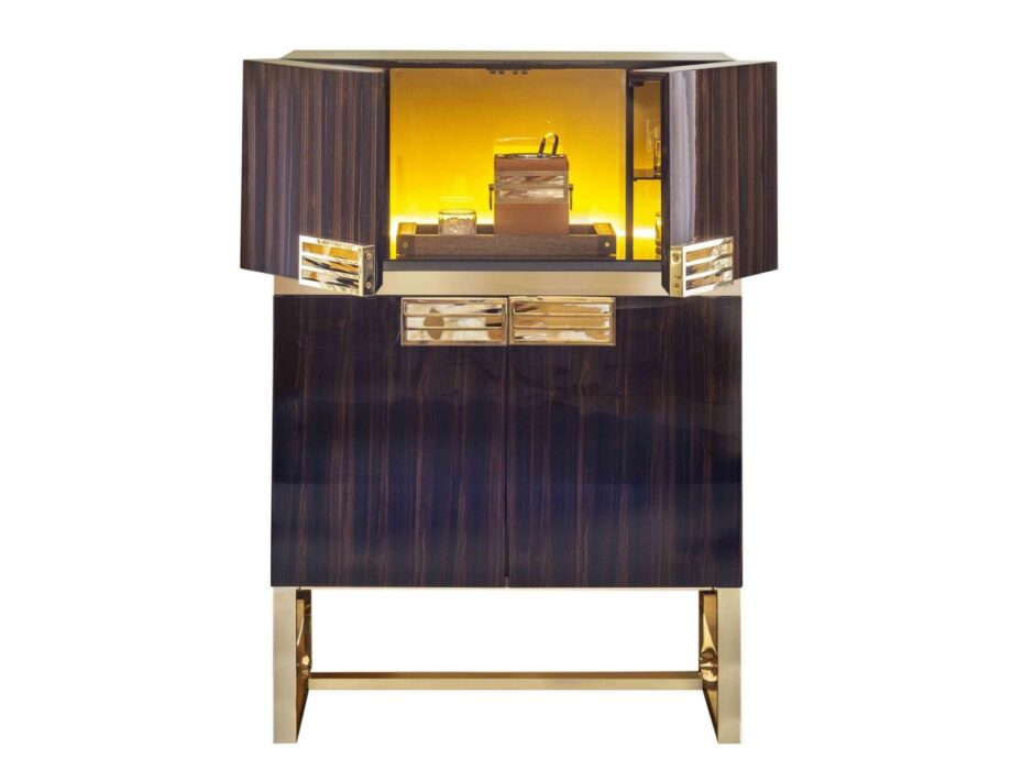 Luxuriously crafted with attention to detail, the Cosmopolitan 6027ebo/ebl bar cabinet from the Electra collection by designer Alessandro Andreucci is a show-stopping piece for those who appreciate exquisite interior design. The cabinet features a stunning Macassar ebony veneer with a matte finish, elegantly elevated by a burnished brass base. The glossy horn and burnished brass handles add a touch of sophistication to the design, making it a standout decorative piece.