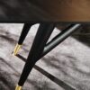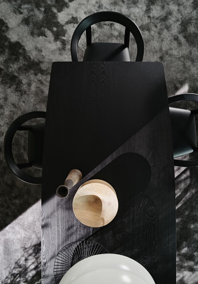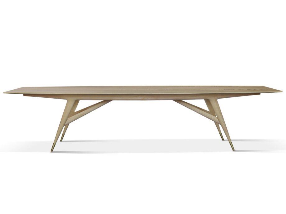 The sleek design of the D.859.1 table features a trapezoidal single-range base with tapered legs, creating a sense of lightness and grace. The generous rectangular top, made of solid ash wood with bronze ferrules, showcases the table’s aerodynamic silhouette. Available in a classic Ash color or a striking Black Stained Ash finish, this table is a versatile addition to any space.