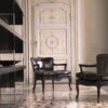 The Dalia armchair is crafted with a hand-carved beechwood structure and offers a choice of luxurious materials such as leather, nabuk, fabric, or velvet for the cover. The padding is made of polyurethane foam with a seat cushion filled with sterilized goose down, providing ultimate comfort and support. Available in various non-removable cover finishes like silvered bronze, black, cracked gold, and bleached white, the armchair can be customized to suit your aesthetic preferences.