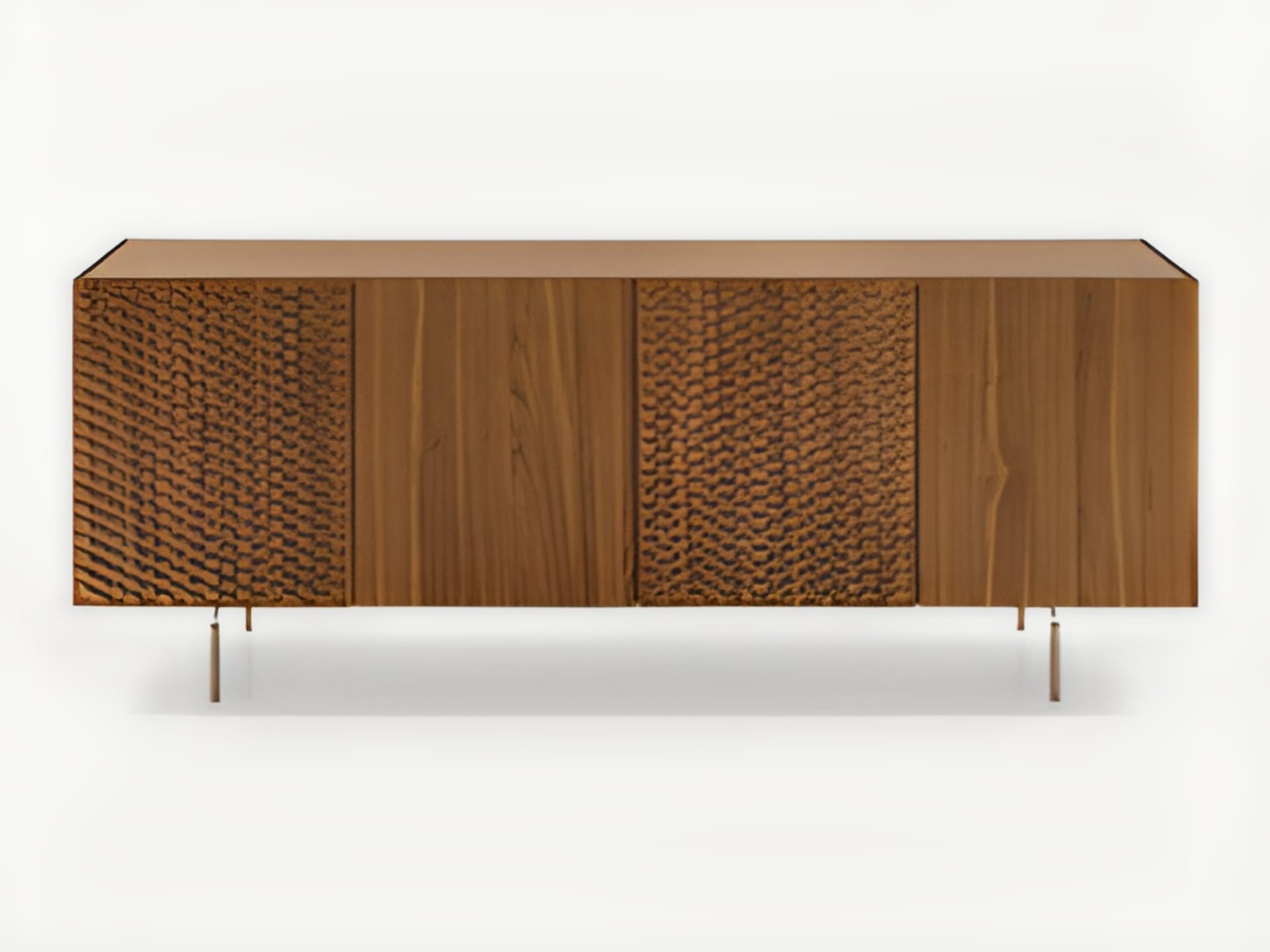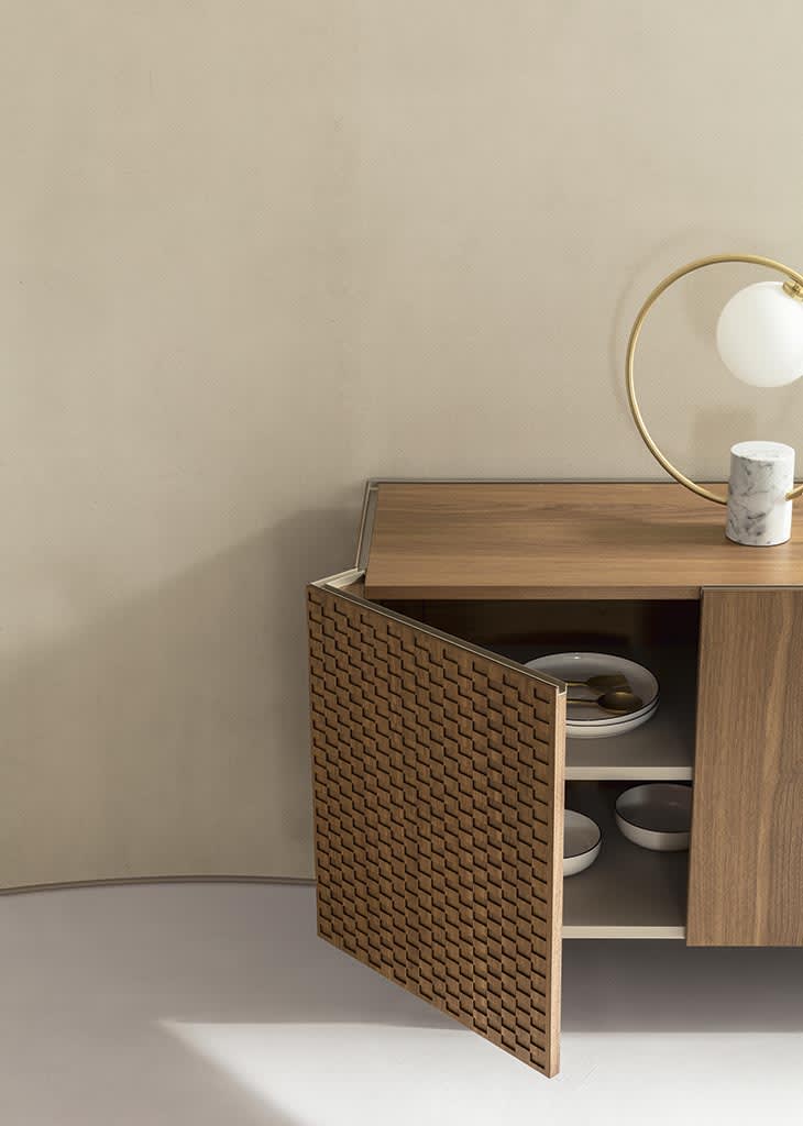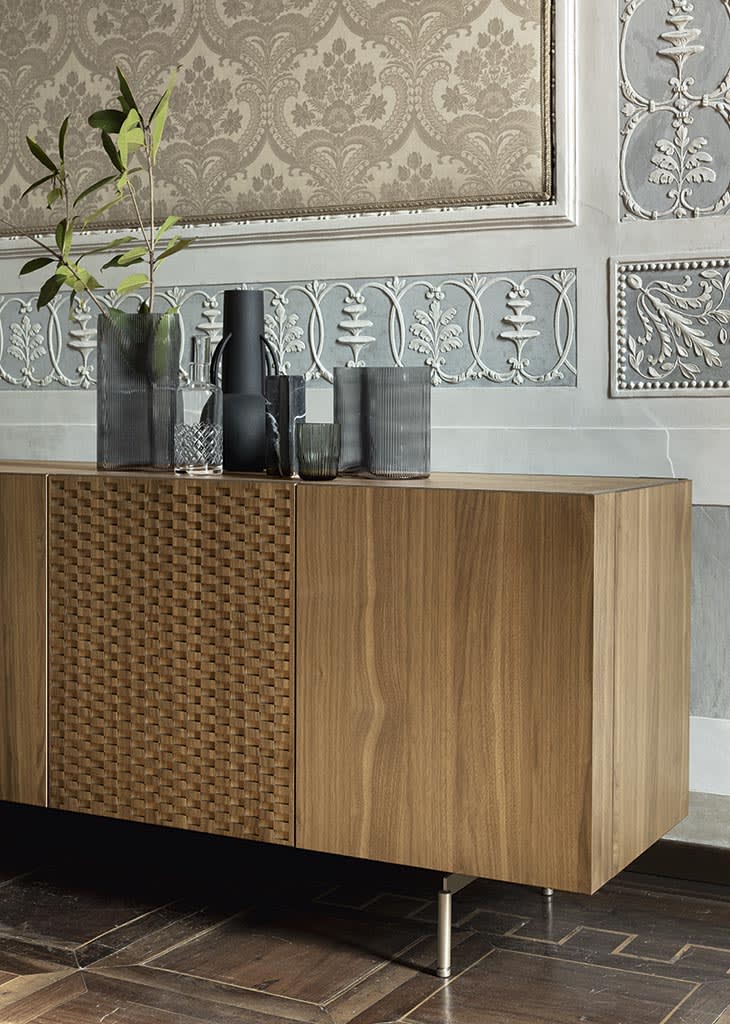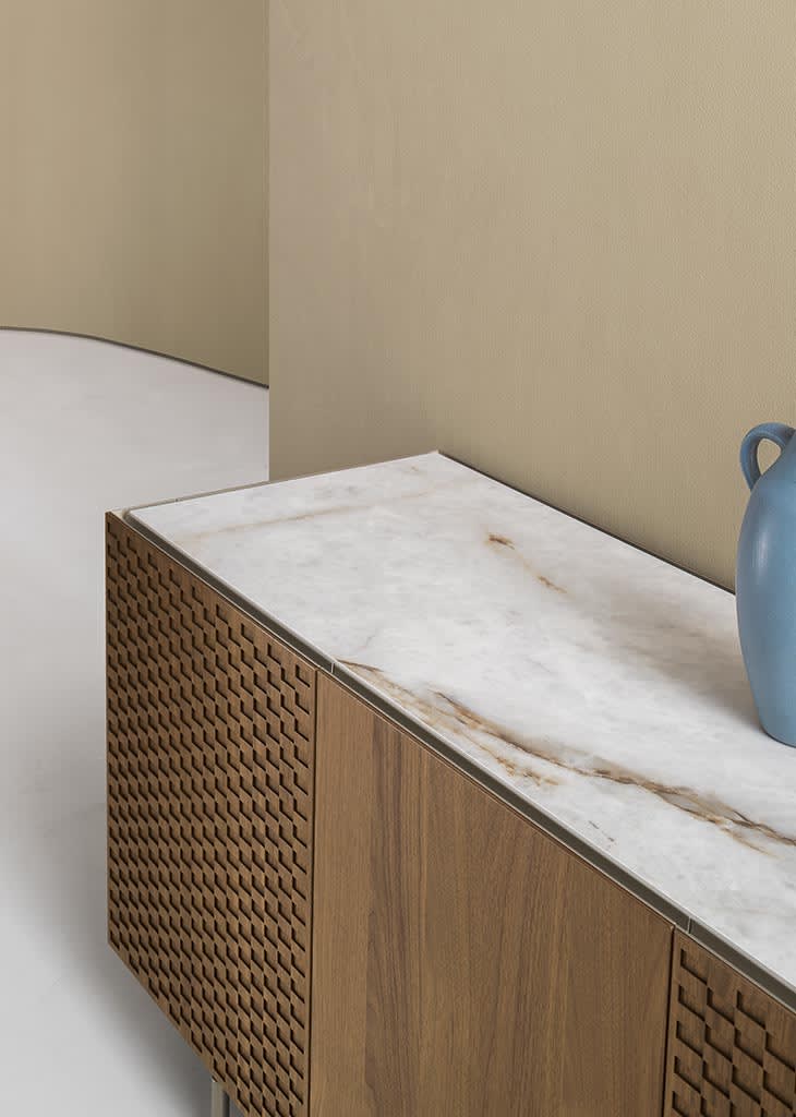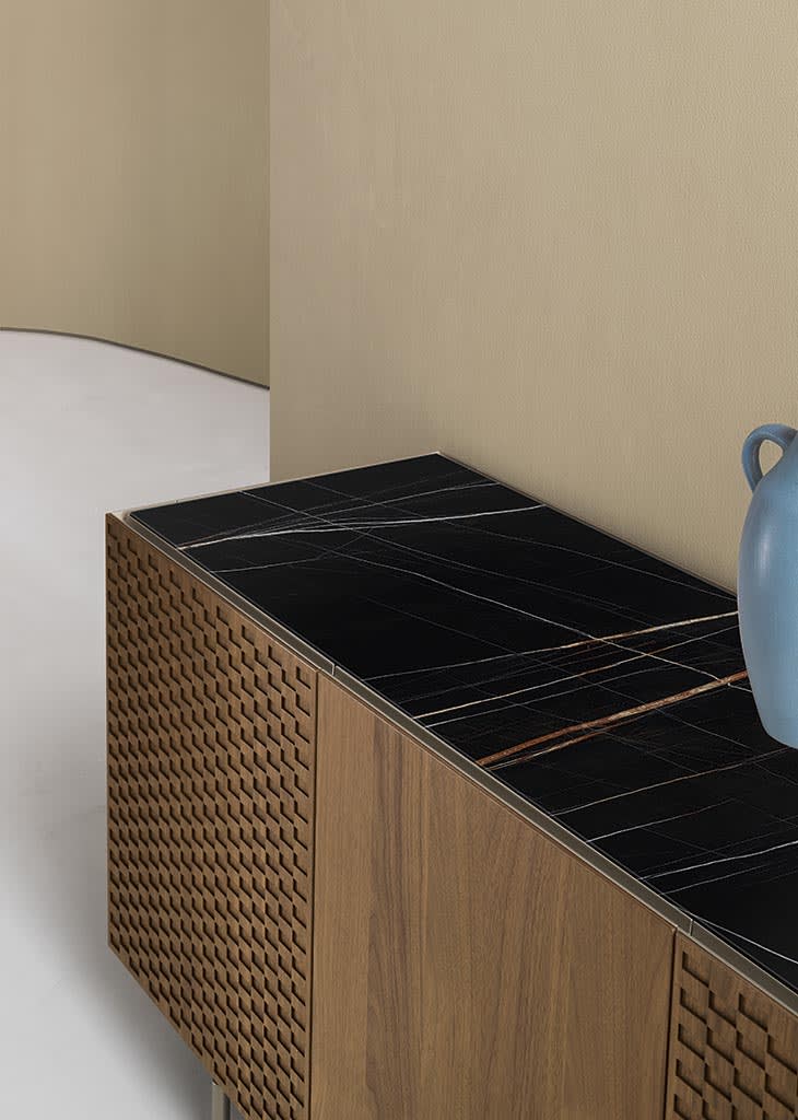 "Dama" is more than just a sideboard; it’s a declaration of style and taste, embodied in an exquisite piece of furniture from the Italian design studio R&D Alf DaFrè. Its name is derived from the unique 3D checkerboard finish adorning two of its four doors. This visual effect creates an intriguing play of light and shadow, alternating between full and empty spaces, making "Dama" a true art object in any interior.