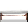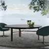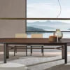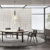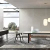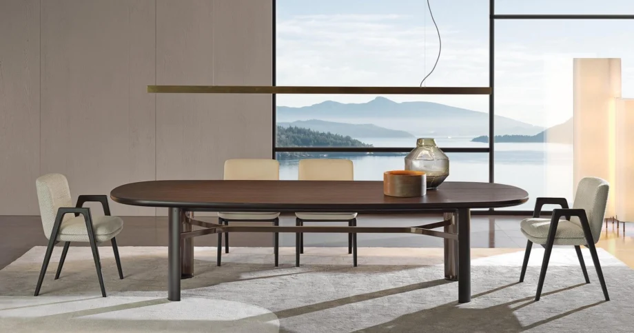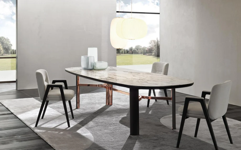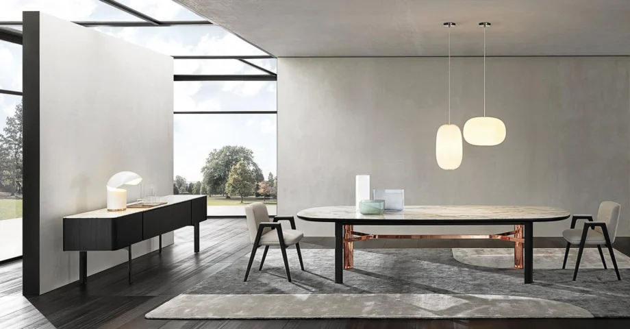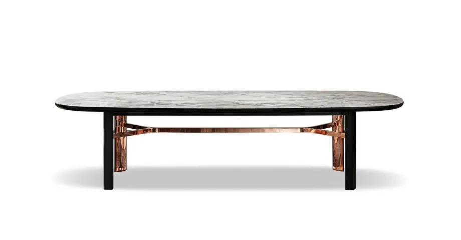 The table’s top is customizable, allowing you to choose from a variety of materials including Calacatta marble, Black back-painted glass, Licorice or Dove Grey flamed ash, and matt ebony. The tone of the support structure is subtly reflected in the top’s perimeter band, adding a cohesive look to the table.