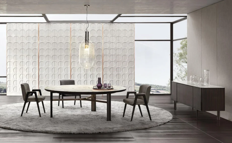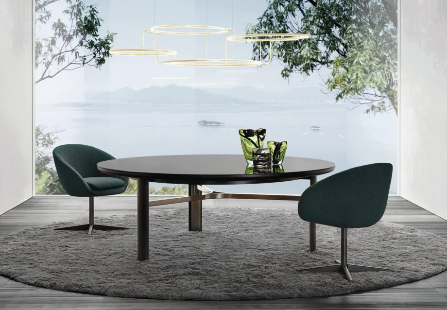 The defining characteristic of this table is its round shape, derived from the concept of a circle. The legs, rounded and concave, along with the crosspiece that connects them, create a unique base that provides stability and enriches the overall design of the table.
