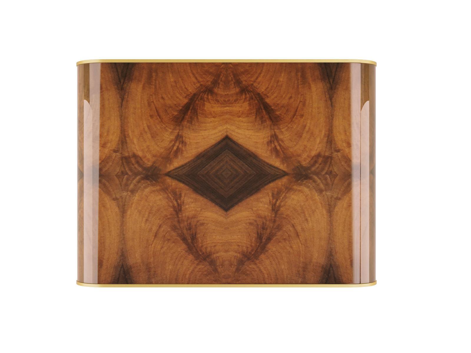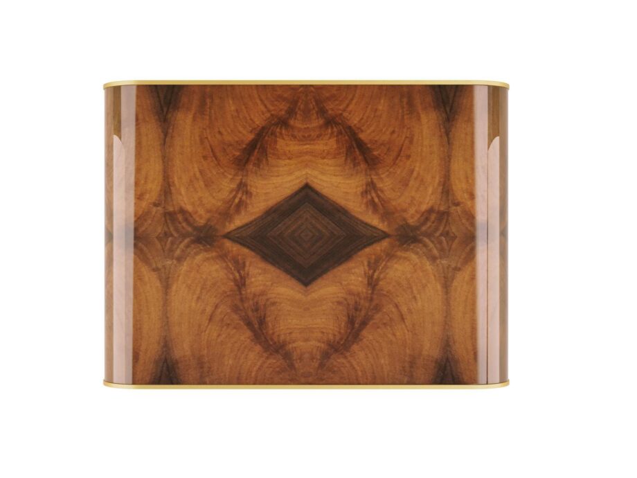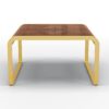 Crafted with meticulous precision, Dea boasts a robust metal structure with a satin gold finish that adds an element of grandeur to your room. Its lustrous sheen subtly reflects light, adding a warm, inviting glow to your space. This is beautifully contrasted with its wooden top in walnut feather, marrying contemporary design with classic elements.