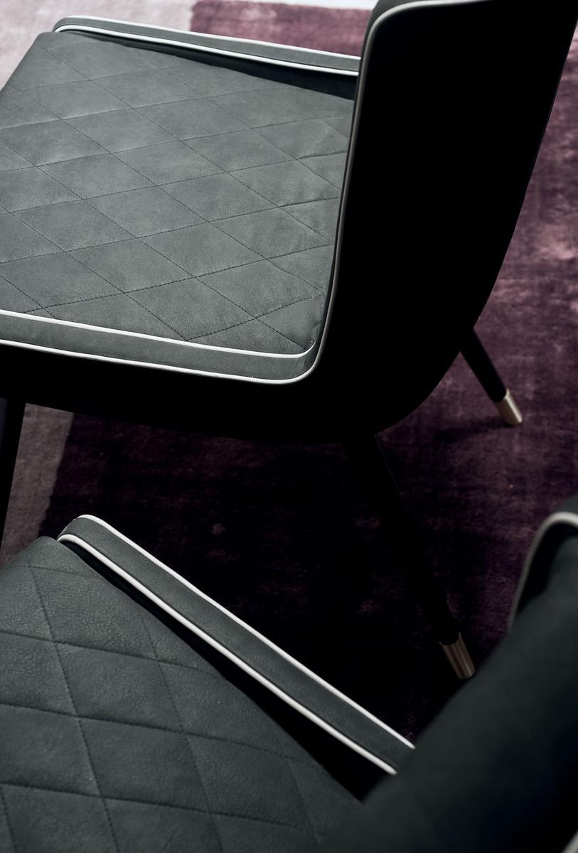 The base of the Dolly Baby chair is finished in semi-gloss black-stained beech, adding a touch of modern flair to the design. The feet are available in satin brass, hand-finished burnished metal, or satin nickeled metal with a matte varnish, creating a striking contrast against the leather upholstery. The cushions and border upholstery are adorned with a special square quilting, adding a touch of sophistication to the overall look.