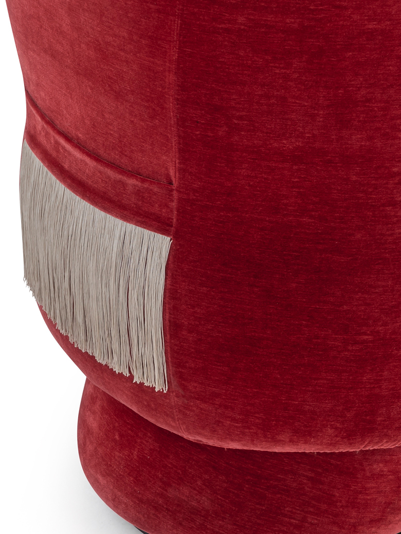 The high-end design of the Dona g armchair is accentuated by its high back, offering excellent support and comfort. The backrest, reminiscent of the train of an evening dress, is adorned with stylish fringes, adding a touch of glamour and sophistication.