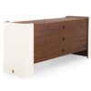For a softer aesthetic, the second version of the Downtown chest of drawers showcases a structure in creamy leather Daino in a Milk shade, with delicate stitching adding a touch of detail. The top and front of the drawers are finished in veneer Mahogany with a matte texture, adding warmth and depth to the piece. The handles, in a sleek rectangular design, are finished in a glossy titanium tone.