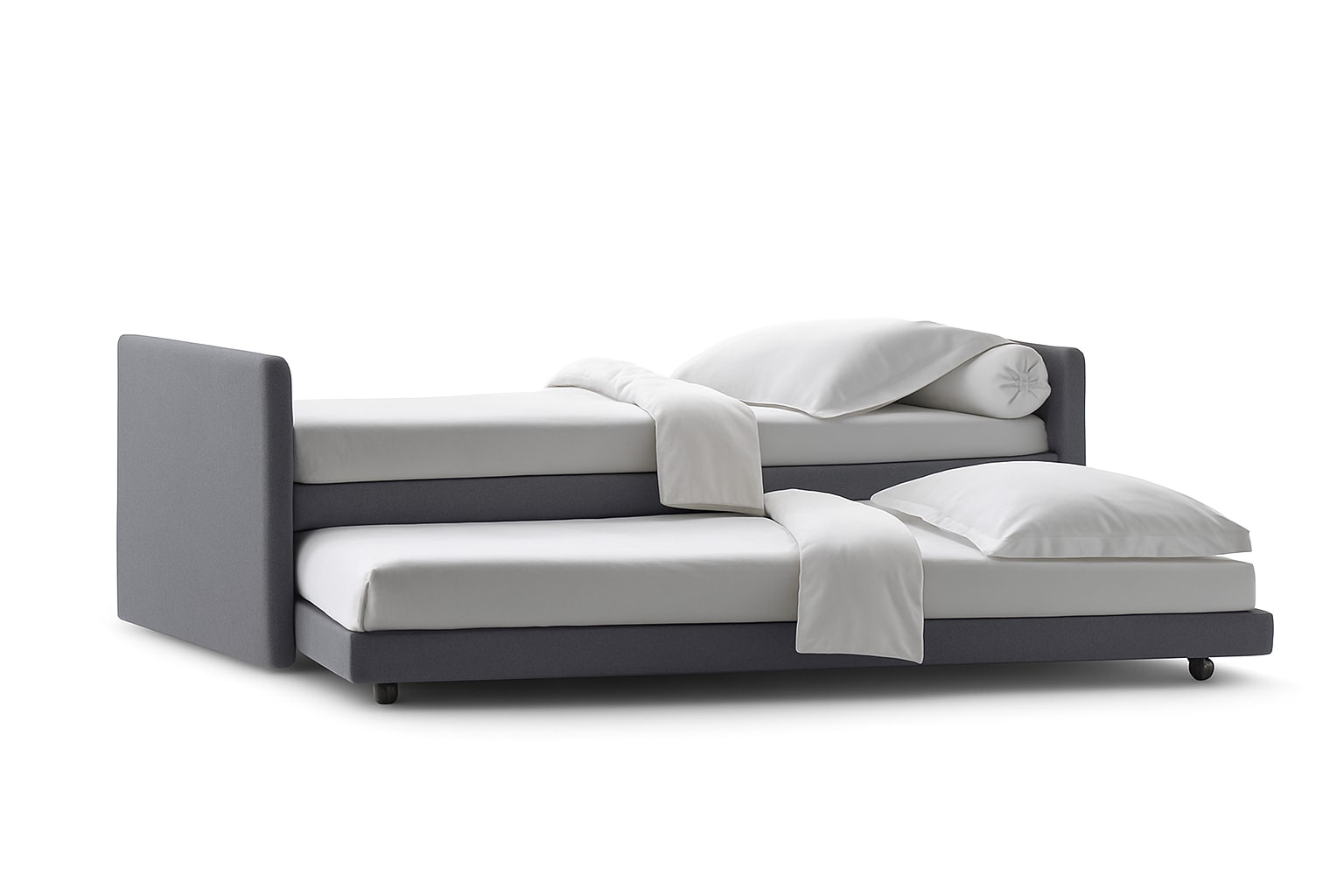 The structure of the Duetto sofa is adorned with completely removable fabric or leather covers, secured with Velcro fasteners for easy maintenance. Whether you choose the fixed bed-base option or the versatile single bed with a trundle bed, the Duetto offers functionality and style in one package. The gas cylinder mechanism allows for the trundle bed to be effortlessly raised to the height of the original bed, providing convenience and comfort for guests.
