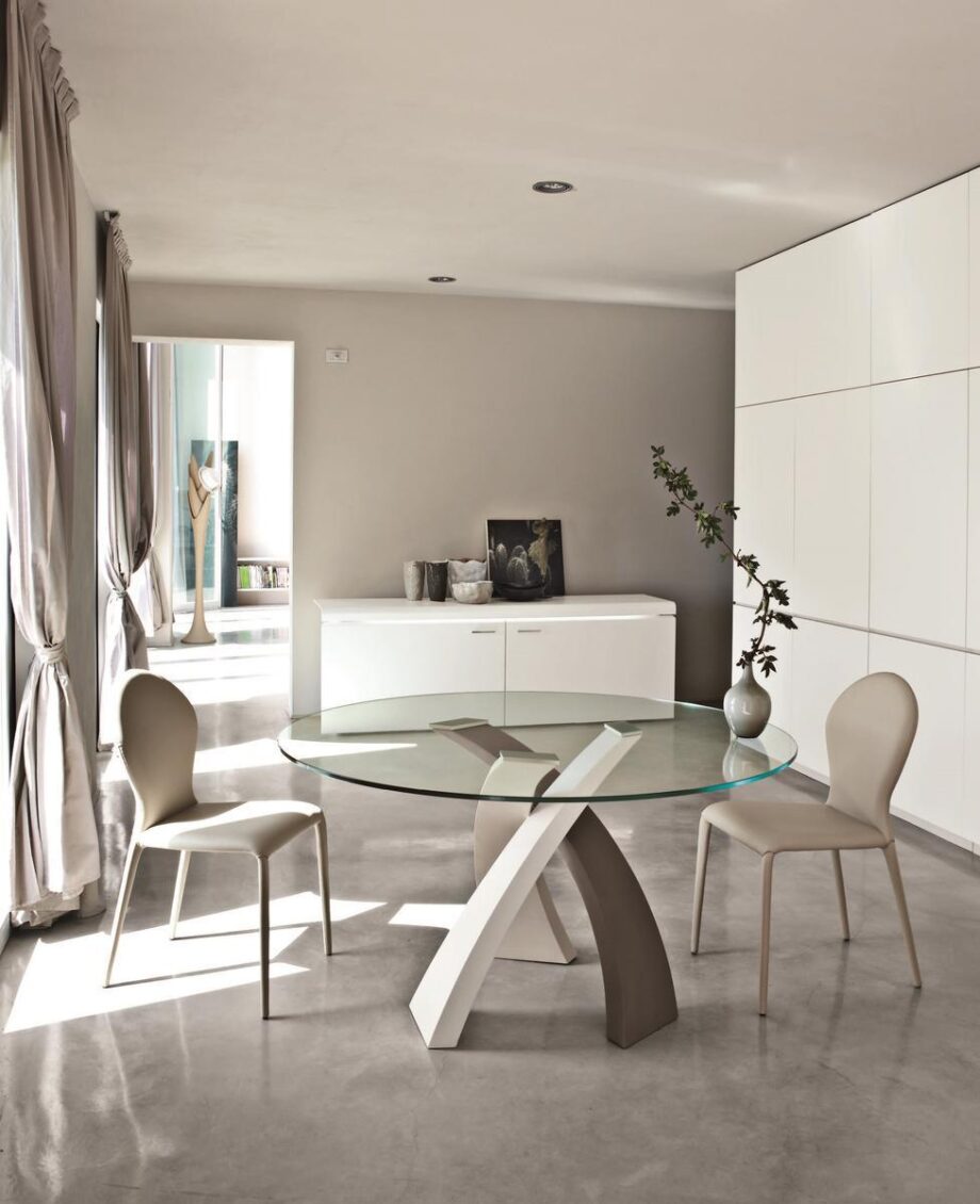 Elevate your living space with the exquisite Eliseo round glass table from Studio 28. Crafted in Italy, this modern masterpiece combines sleek design with high-quality materials to create a stunning focal point in any room. The tempered glass top is seamlessly fused to a steel plate using UV rays, creating a seamless and durable surface that is as beautiful as it is functional.
