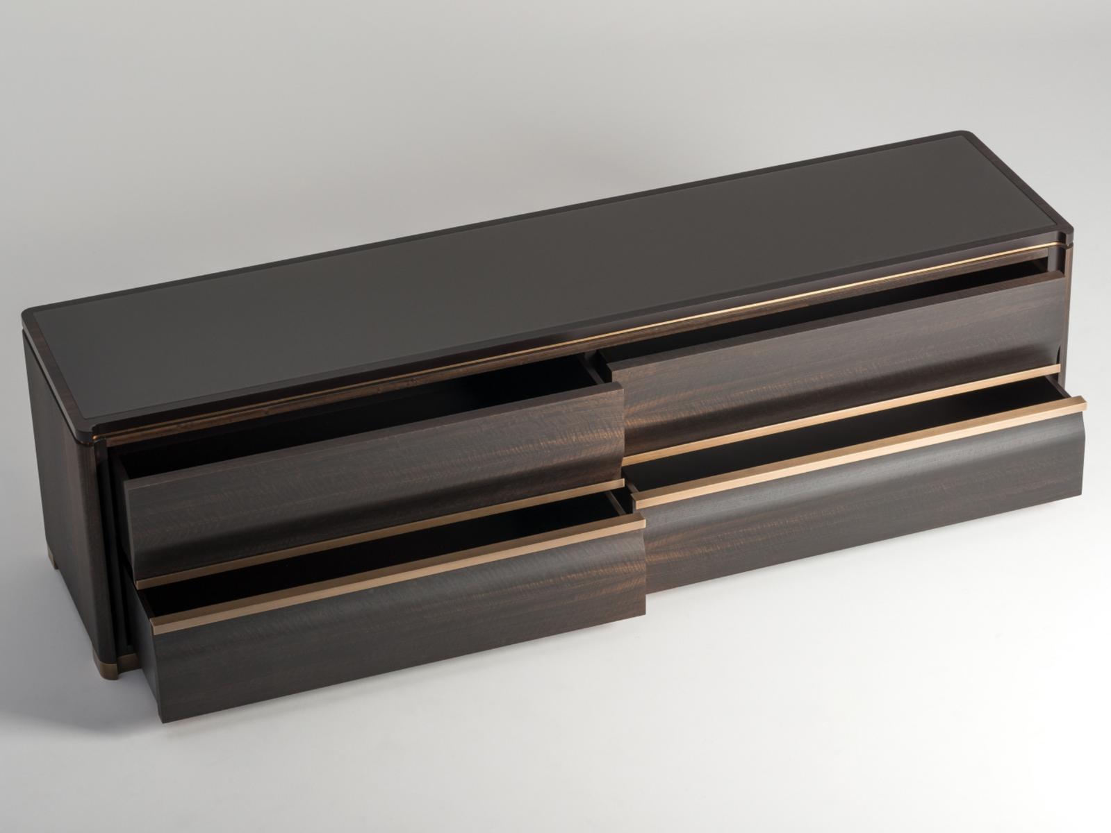 With drawers for added functionality, the Ercole TV cabinet features a sleek lacquered glass top and polished brass handles and feet, elevating its design to a new level of sophistication. The interior of each cabinet is lined with genuine leather in a rich chocolate color, providing a luxurious space to store your belongings.