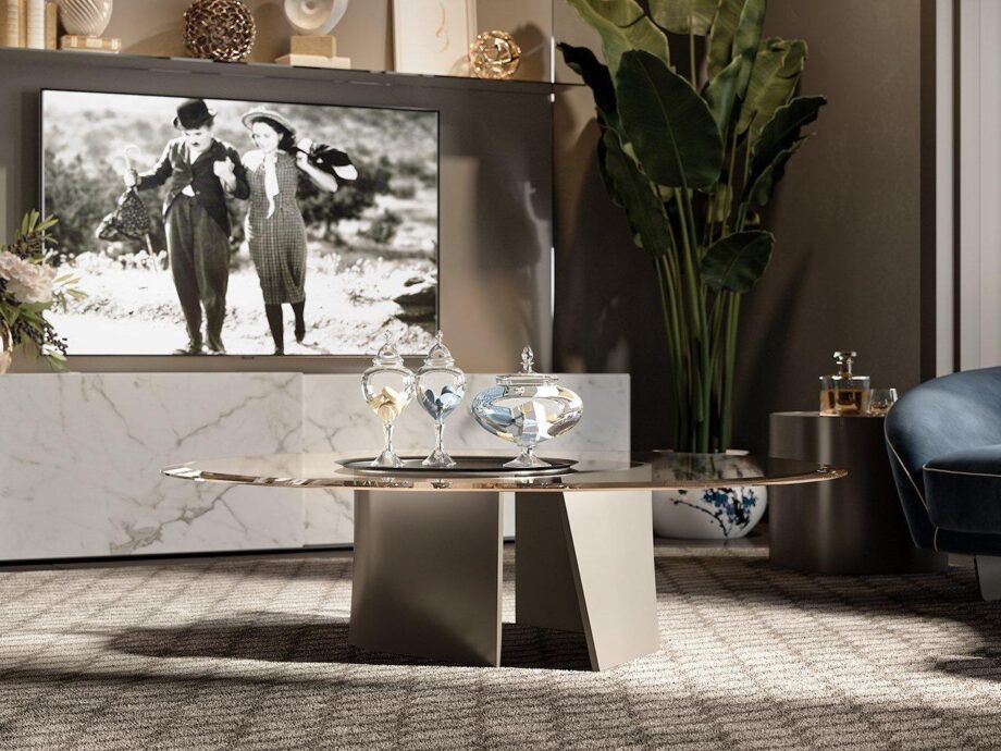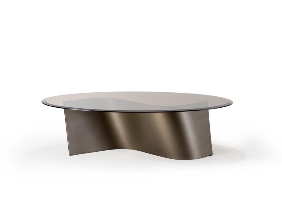 Designed with an oval shape, the Esse 40 coffee table features a base made of bended additional reasonable glass in luxurious finishes such as Bronze, Brass, Dark metal, and Titanium. The top is adorned with stunning bronze glass, adding a touch of glamour to the overall design. The sleek and sophisticated silhouette of this table is sure to make a statement in any room.