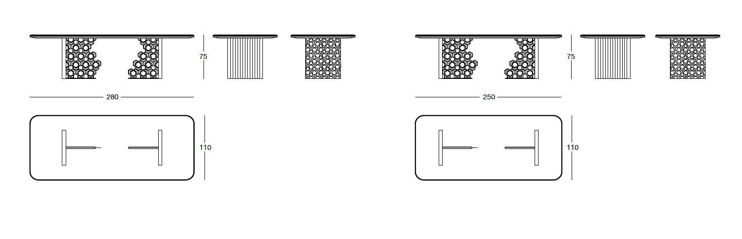 Crafted from premium veneer, the Excelsior table boasts a striking base adorned with a central leg upholstered in sumptuous P3 Suede leather, intricately quilted with vertical ribbing or 3D Sequence decoration for a touch of sophistication. The base features a stunning finish in a variety of opulent hues, including bright light gold, matt Champagne gold, and bright chrome, among others.
