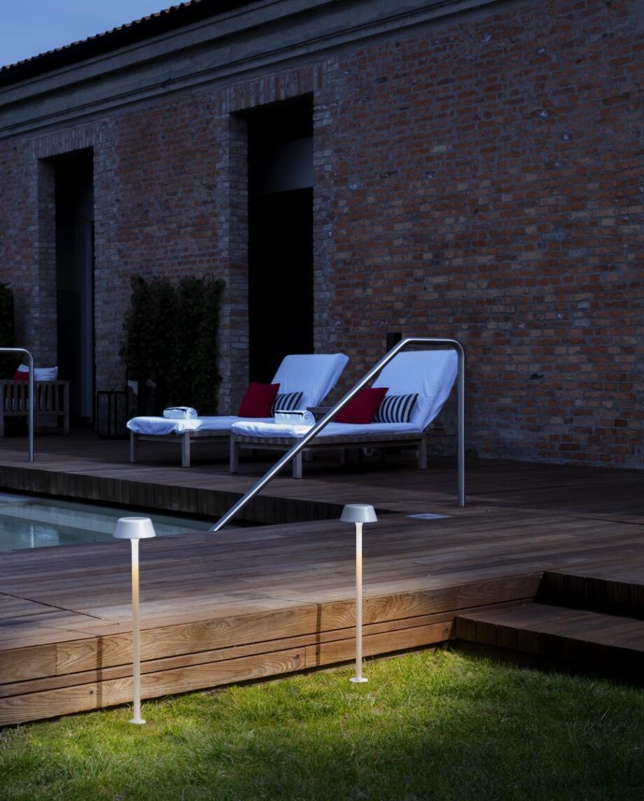 The Firefly In The Sky bollard light features a removable head with a magnetic coupling system, a rechargeable battery via USB-C, and a STEP DIM control with five light intensity settings. This versatile light has a battery life of up to six hours at full power and up to 24 hours at 25% intensity, making it ideal for long evenings outdoors.