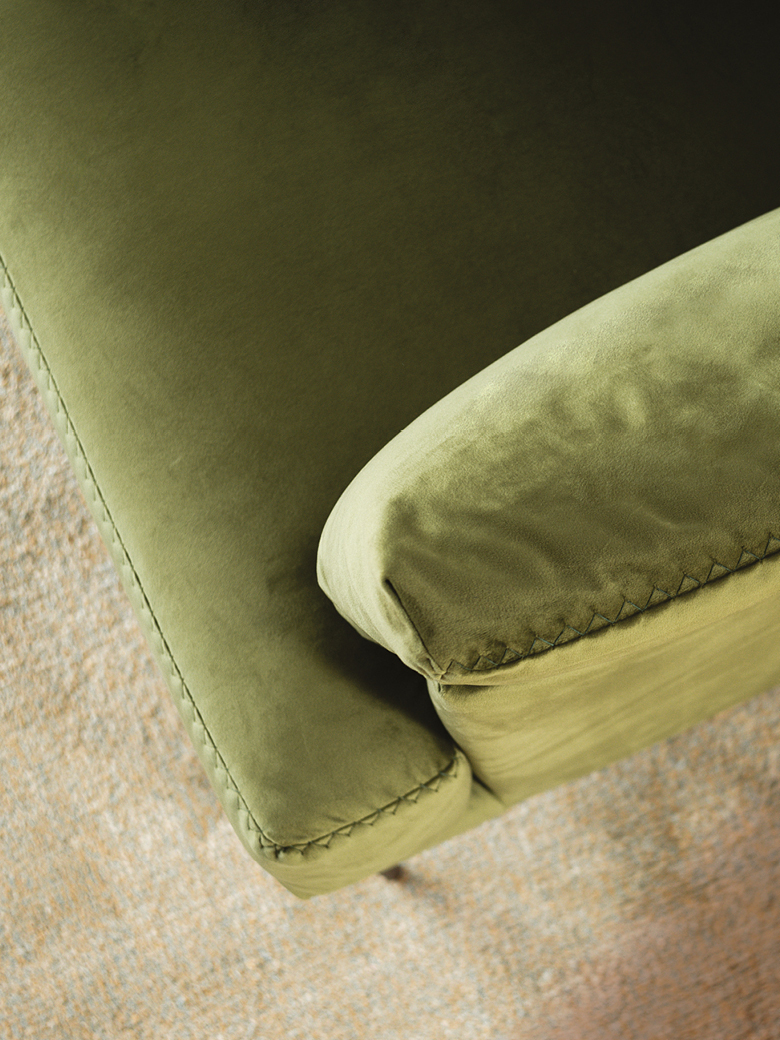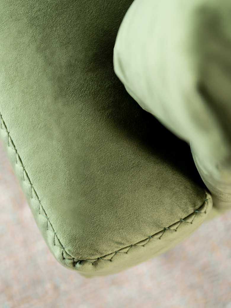 The Fleur armchair features a sleek, metal trestle-based design, adorned with intricate, decorative stitches that elevate its aesthetic appeal. Its pin-shaped legs add a unique touch to its design, ensuring it stands out in any setting. Despite its compact proportions, this armchair makes a bold statement, effortlessly enhancing even the smallest of spaces.