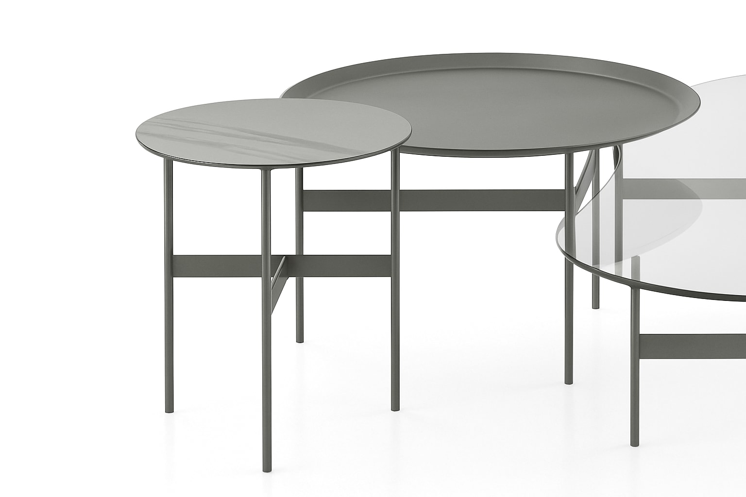 The Formiche coffee tables feature a slender supporting structure that mimics the delicate legs of the sofa system, giving them a light and airy appearance. The rounded support in pewter-painted steel is connected by cross-bars to support the various top shapes available, including round, oval, or kidney bean.