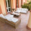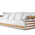 The Galloway day beds feature a sturdy design in iroko strong wood and birch plywood, ensuring durability and longevity. The base is constructed with tempered steel and armrest support in aluminum cast with a protective transparent coating. The brass logo engraved with chrome finishings adds a touch of opulence to the overall look.