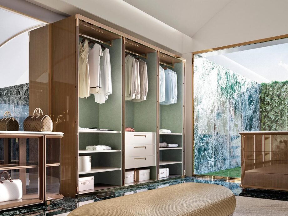 Gilda is adorned with details in stainless steel and brass, adding a touch of opulence to the design. The back panels are upholstered in touch fabric, completing the look with a soft and inviting feel. Whether you’re organizing your wardrobe or displaying your favorite items, Gilda offers both functionality and beauty in one exquisite piece.