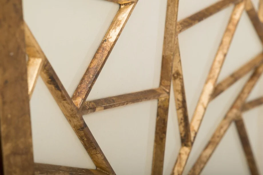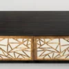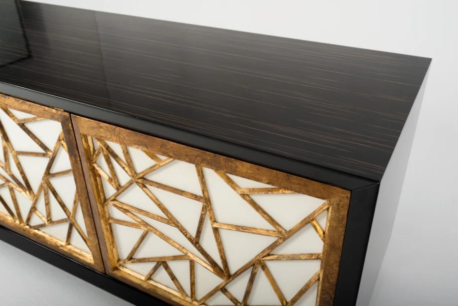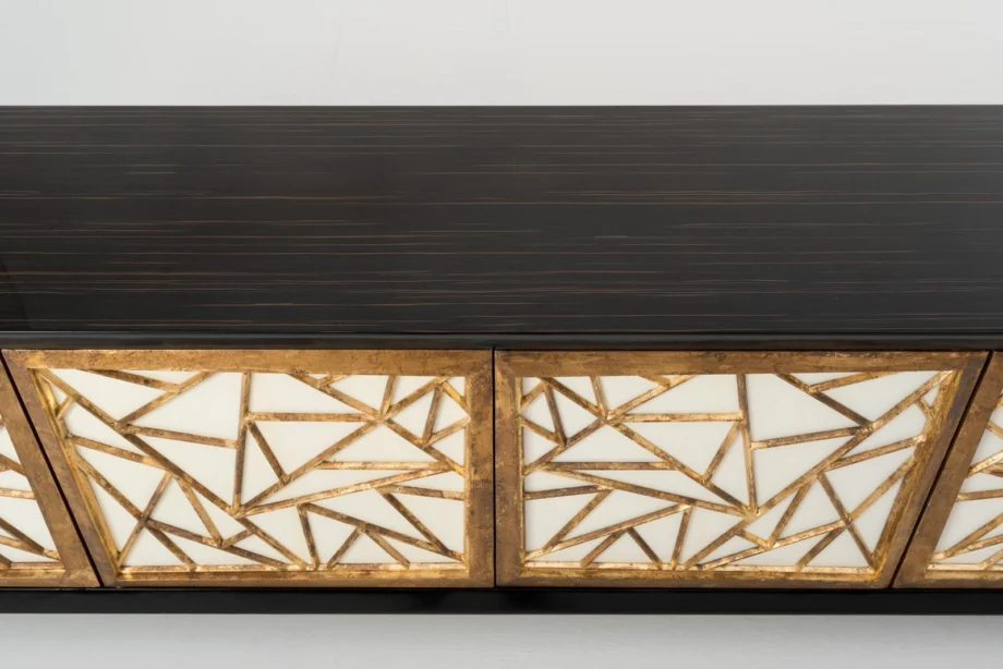 The Gillo sideboard is a functional and stylish storage solution, featuring spacious compartments to neatly organize your belongings. The glossy lacquered Macassar ebony construction with subtle orange streaks exudes elegance, while the doors adorned in antique fabric and intricate woodwork in a gold leaf finish add a touch of sophistication.