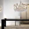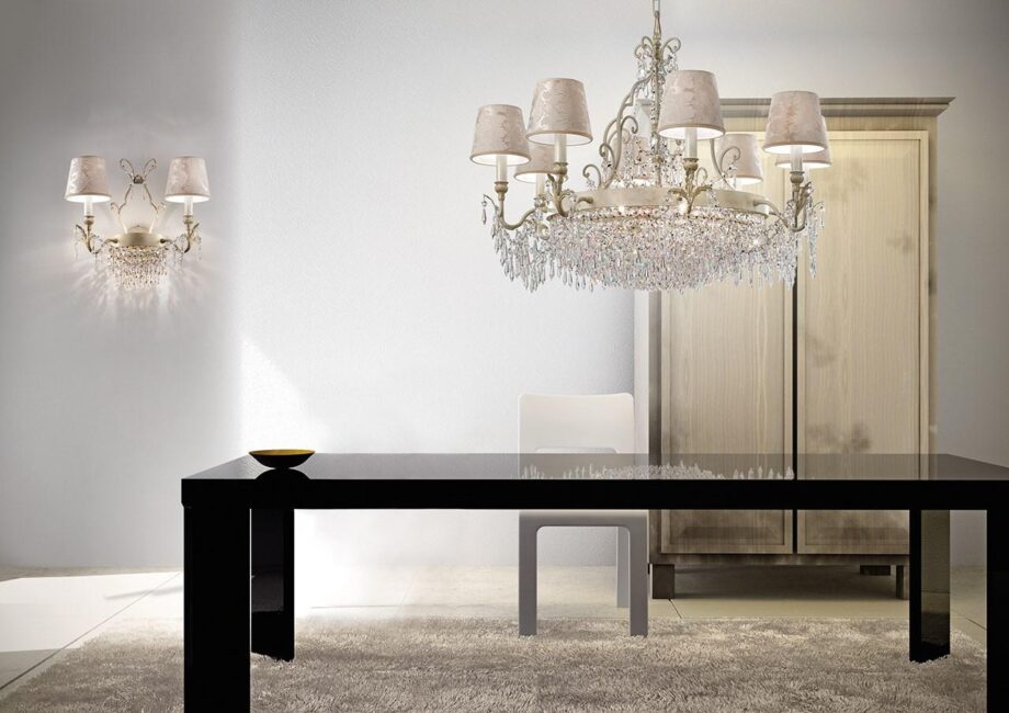 The metal construction, available in a stunning ivory or polished finish, is adorned with cascading 30% lead crystal pendants that catch the light beautifully. The rich damask lampshades add a touch of luxury and perfectly complement the overall design of the lamp.