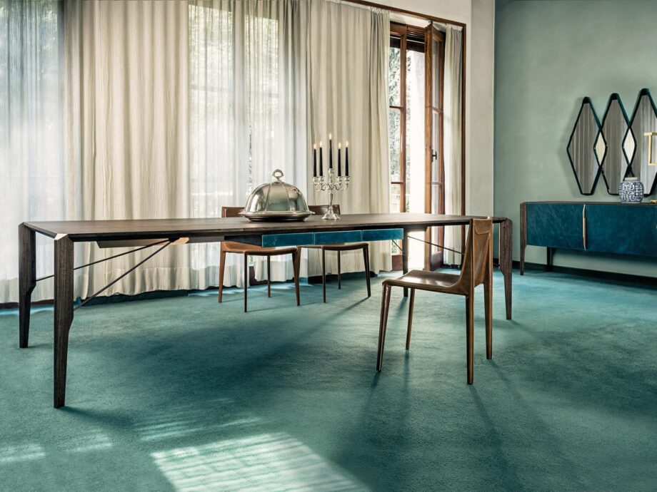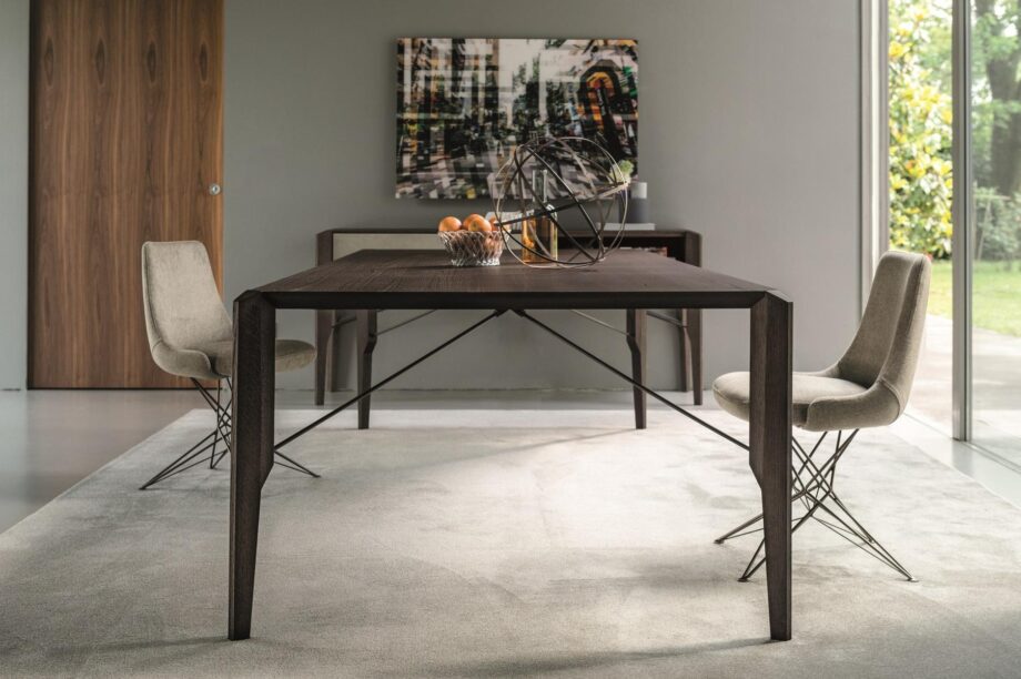 The metal struts that support the structure of the Glorious table give it a sense of lightness and airiness, creating a visually captivating piece that is sure to be the focal point of any dining room. Whether you prefer a bold aubergine hue or a subtle grey tone, the customizable leather drawer adds a pop of color and personality to this already stunning table.
