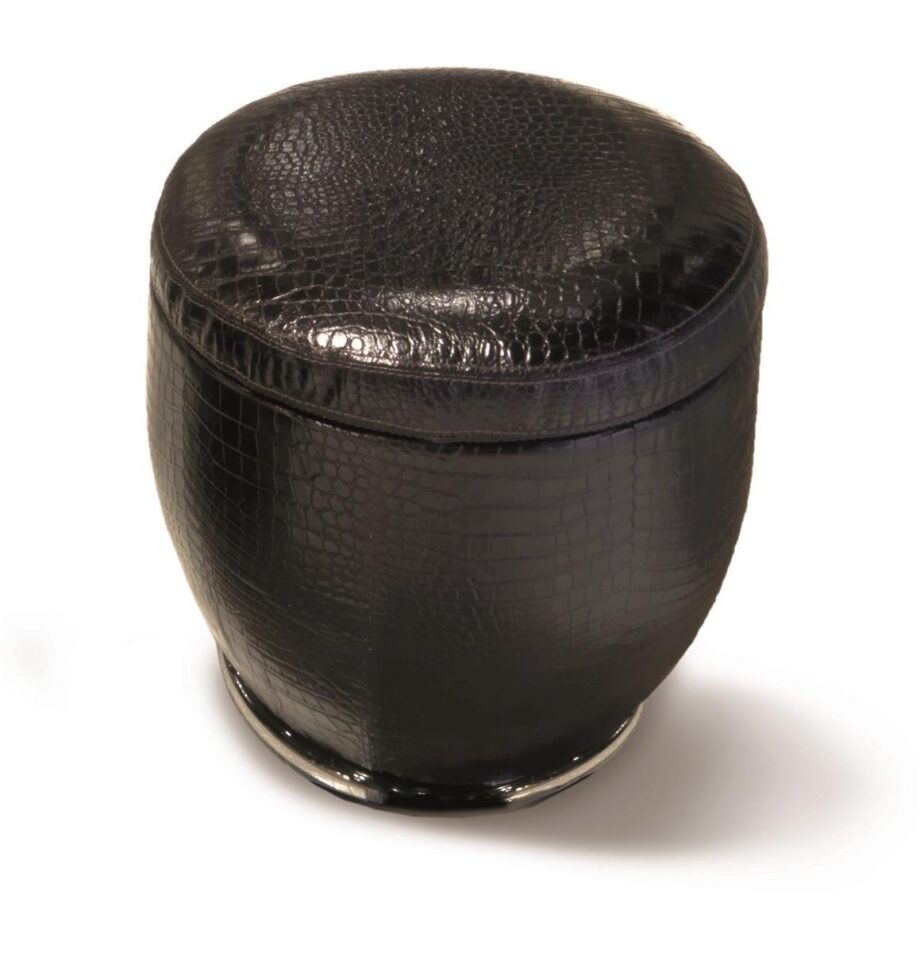 Part of the exclusive Loveluxe 2014 royal collection, the Godwin pouf is the creation of renowned designer Giuseppe Iasparra. Made in Italy, this unique furniture piece features a fiberglass structure, wooden seat, and high-density polyurethane foam for ultimate comfort. The leather upholstery exudes elegance, while the metal base is available in a range of exquisite finishes including bright light gold, champagne gold, and satin bronze.