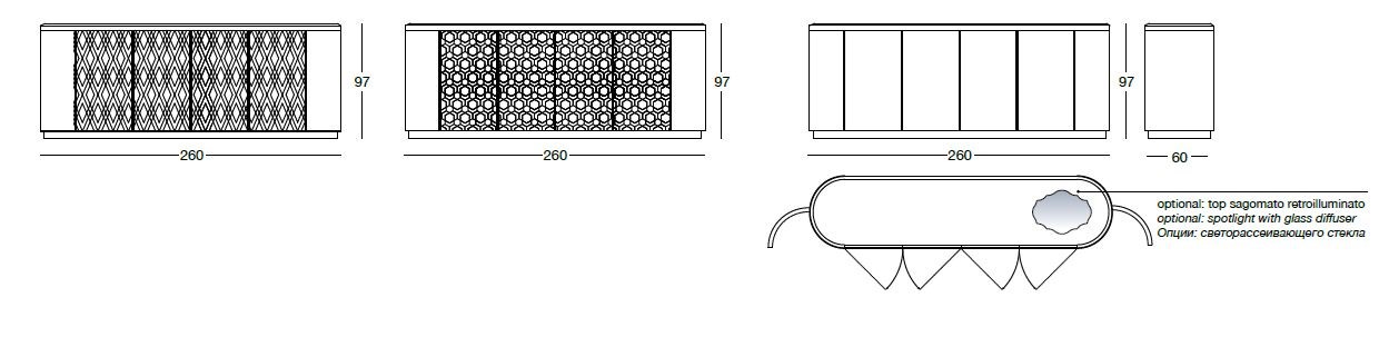 The interior of the sideboard features dark-stained zebrano wood, beautifully complementing the striking exterior design. The intricately designed doors and drawers boast a raised diamond or sequence pattern, available in the exquisite P.3 Suede and Lusso range. The elegant ground metal base and edge finishes in various tones add a touch of opulence to this already exquisite piece.