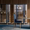 Grace features shelves in glass with a wood frame, providing ample space to display your treasured items in a chic and organized manner. The interior is equipped with integrated LED lighting, illuminating your collection with a warm and inviting glow. All profiles are meticulously finished in chrome-effect leather, adding a refined touch to the overall design.