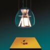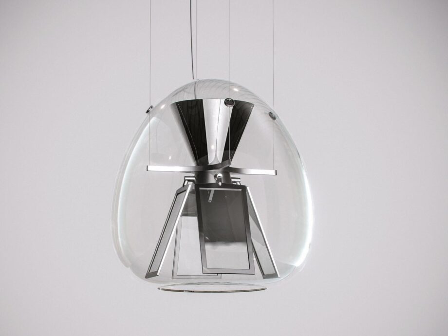 Its structure houses two separate optical devices that provide a light quality tailored to design different scenarios, ensuring top performance. It features four pairs of adjustable OLED panels that emit light from both sides, creating a convergence between the source and the reflector. When turned off, these panels serve as a mirrored surface, reflecting their surroundings and the light emitted by the top LED source.