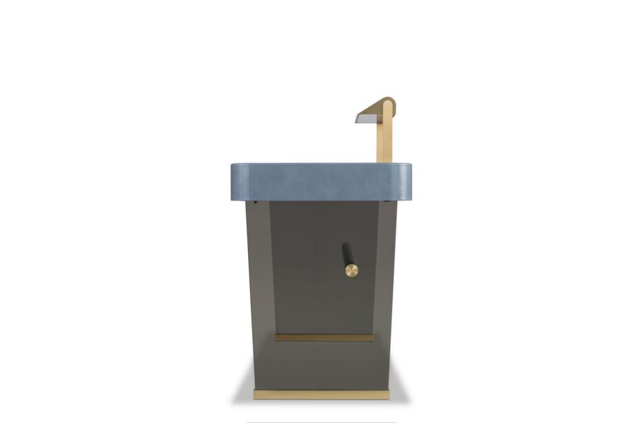 The desk comes complete with a reading lamp, featuring a satin-finished brass structure and an LED strip that offers warm and inviting lighting. The power supply is powered by two 12V batteries for convenience. The base of the lamp is made of tempered bronze paste-dyed glass with satin-finished brass terminal piping, adding a touch of elegance to your workspace.